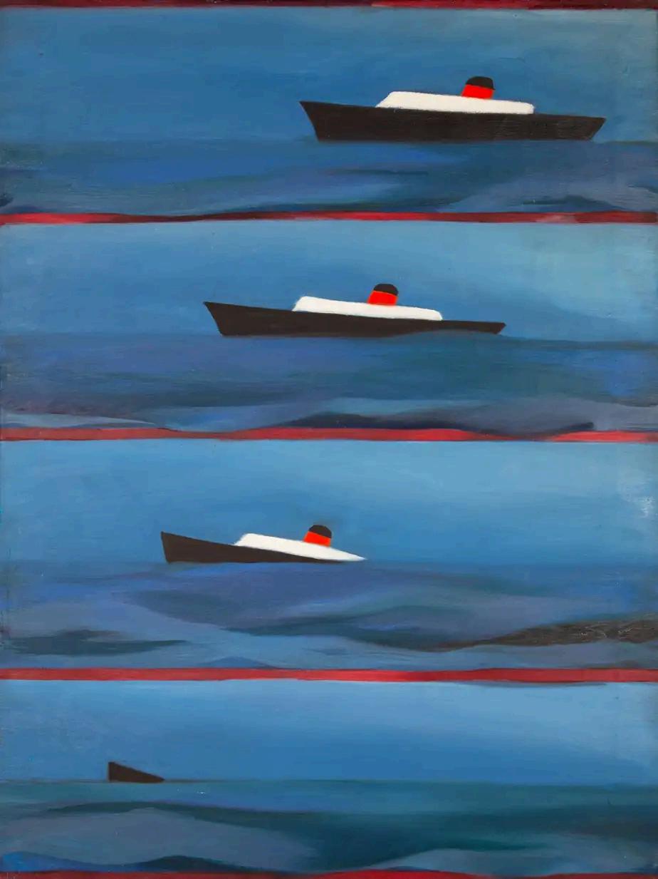 En haut : David Elliot, Caruso, 1986. À droite : Santiago Yahuarcani, Sesión de tabaco, 2022 DAVID ELLIOTT/BIENNALE D’ART DE TORONTO