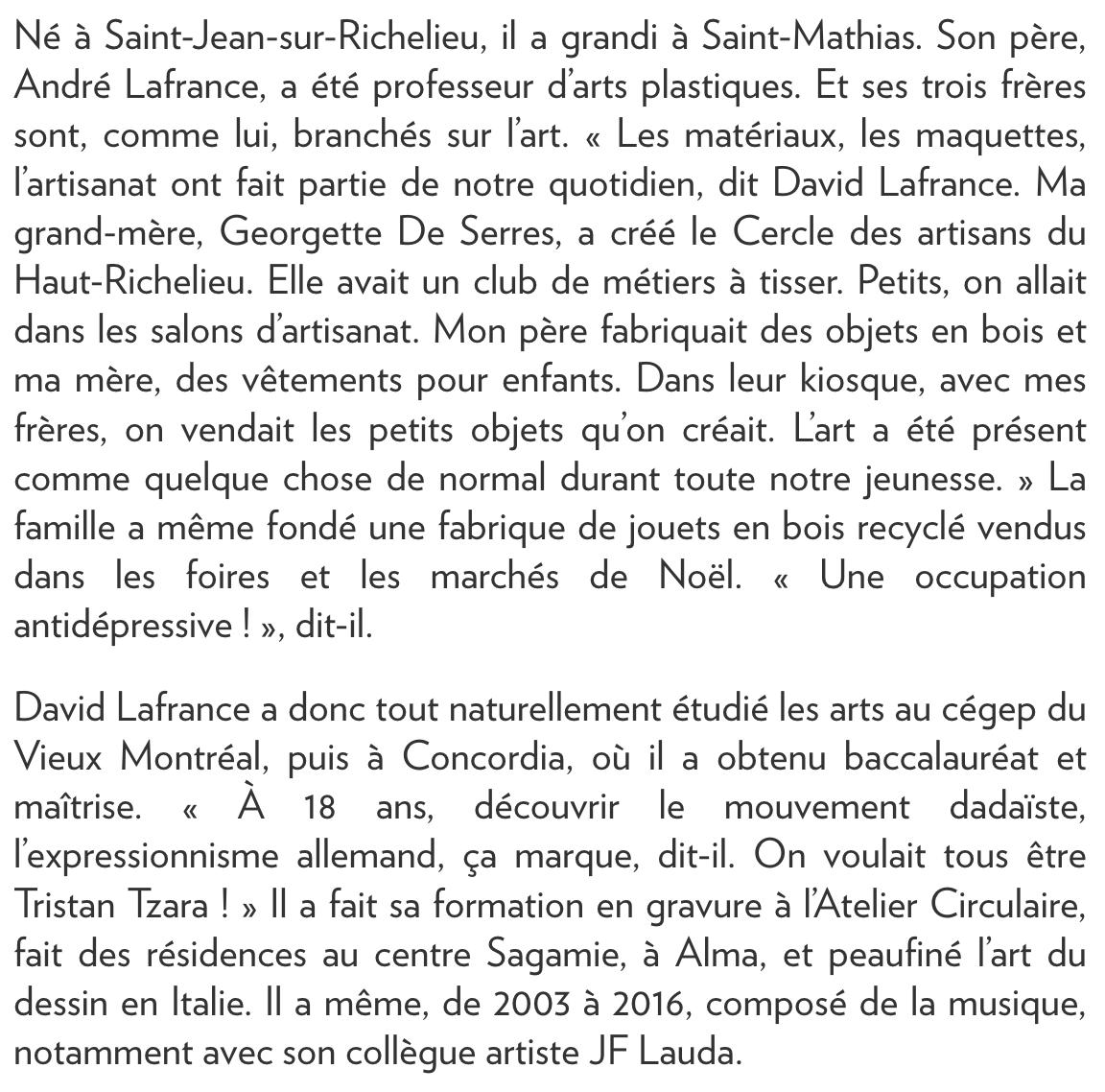 David Lafrance a donc tout naturellement étudié les arts au cégep du Vieux Montréal, puis à Concordia, où il a obtenu baccalauréat et maîtrise. « À 18 ans, découvrir le mouvement dadaïste, l’expressionnisme allemand, ça marque, dit-il. On voulait tous être Tristan Tzara ! » Il a fait sa formation en gravure à l’Atelier Circulaire, fait des résidences au centre Sagamie, à Alma, et peaufiné l’art du dessin en Italie. Il a même, de 2003 à 2016, composé de la musique, notamment avec son collègue artiste JF Lauda.