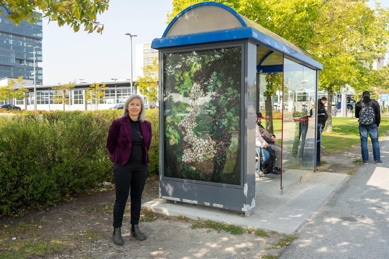 SylvieFraserdevantl’abribushabiteparsonoeuvredanslecadredeZoomArt2023.(Photogracieusete)