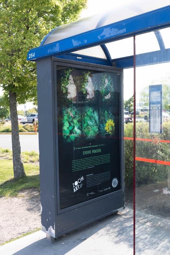 Les 30 artistes dont les œuvres ont été sélectionnées dans le cadre de ce projet viennent de partout au Canada. Sylvie Fraser, créatrice de l’œuvre 8 moments de croissance, 2011-2012, affichée sur un abribus près du Collège Montmorency, est la seule participante lavalloise.