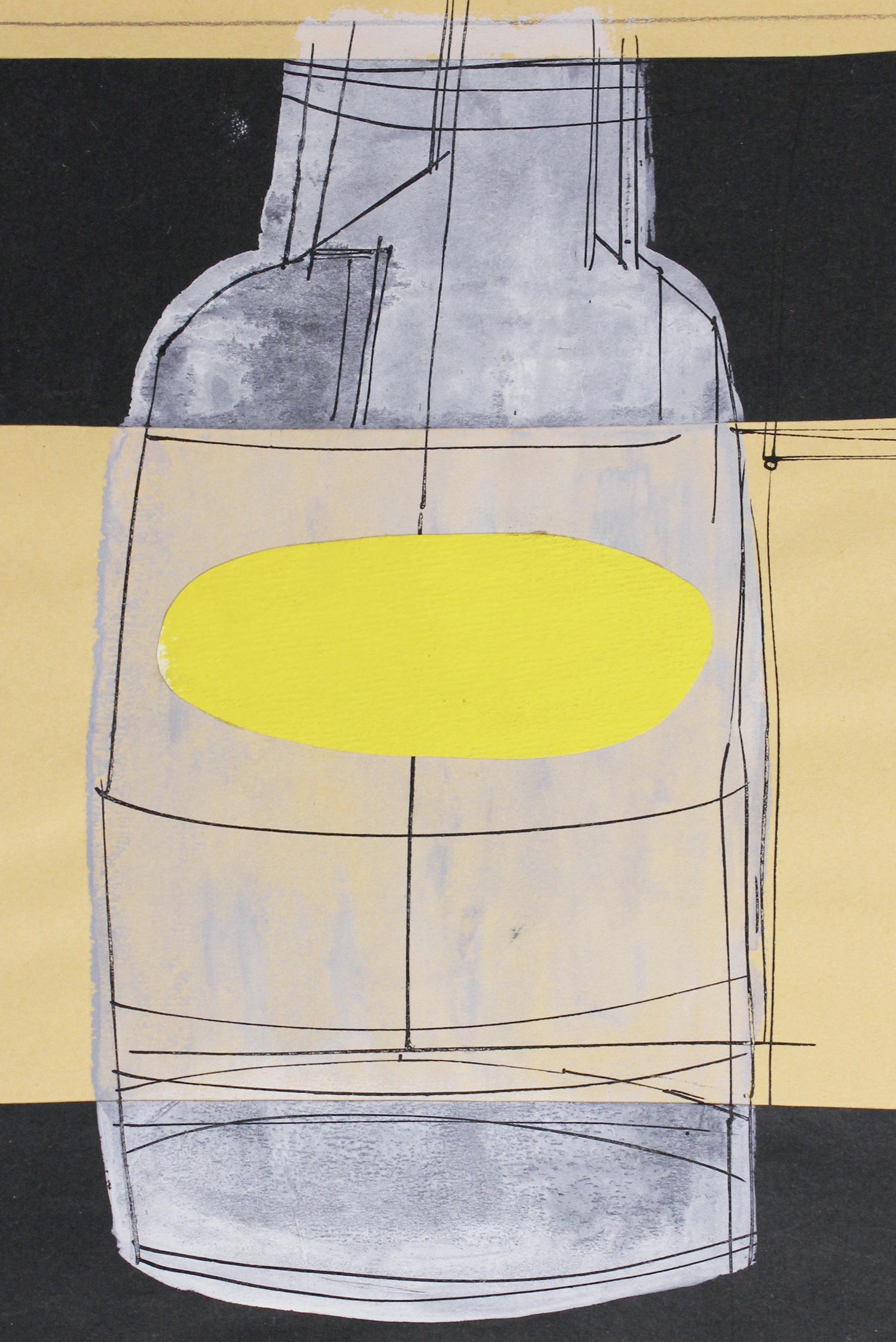 titular bottle in the center, framed by wide black bands at top and bottom. A luscious, undiluted blob of yellow paint, a cutout, suggests the surface of liquid in the bottle. The three works, masterful in their own way, seem to have sprung from separate sources of creativity.