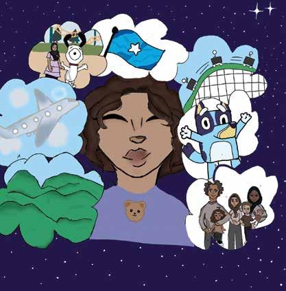 In my artwork, I’m sleeping as I dream about my life and important figures in it: my family, going to Valley Fair every year, moving to Africa and others.