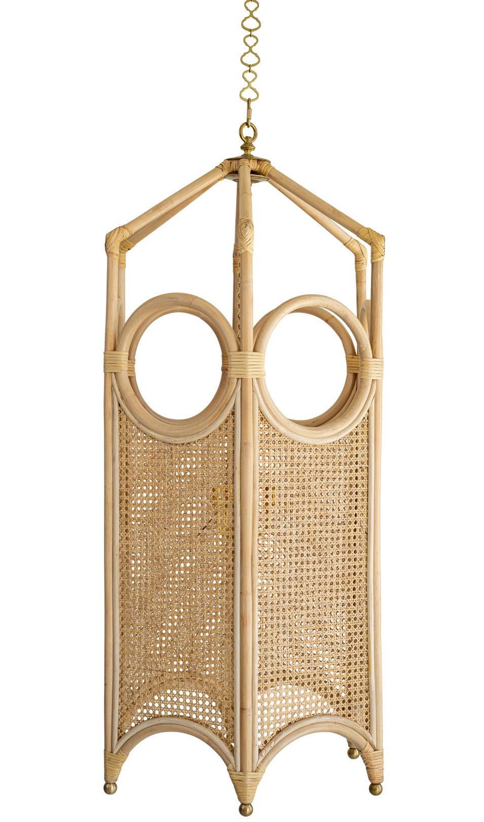 THE CHINOISERIE SILHOUETTE OF THE TEMPLE PENDANT SETS THE STAGE FOR DAPPLE LIGHT TO PEEK THROUGH CLASSIC CANING. DELICATE YET DRAMATIC, THIS CEILING PENDANT IS A SHOWSTOPPER!