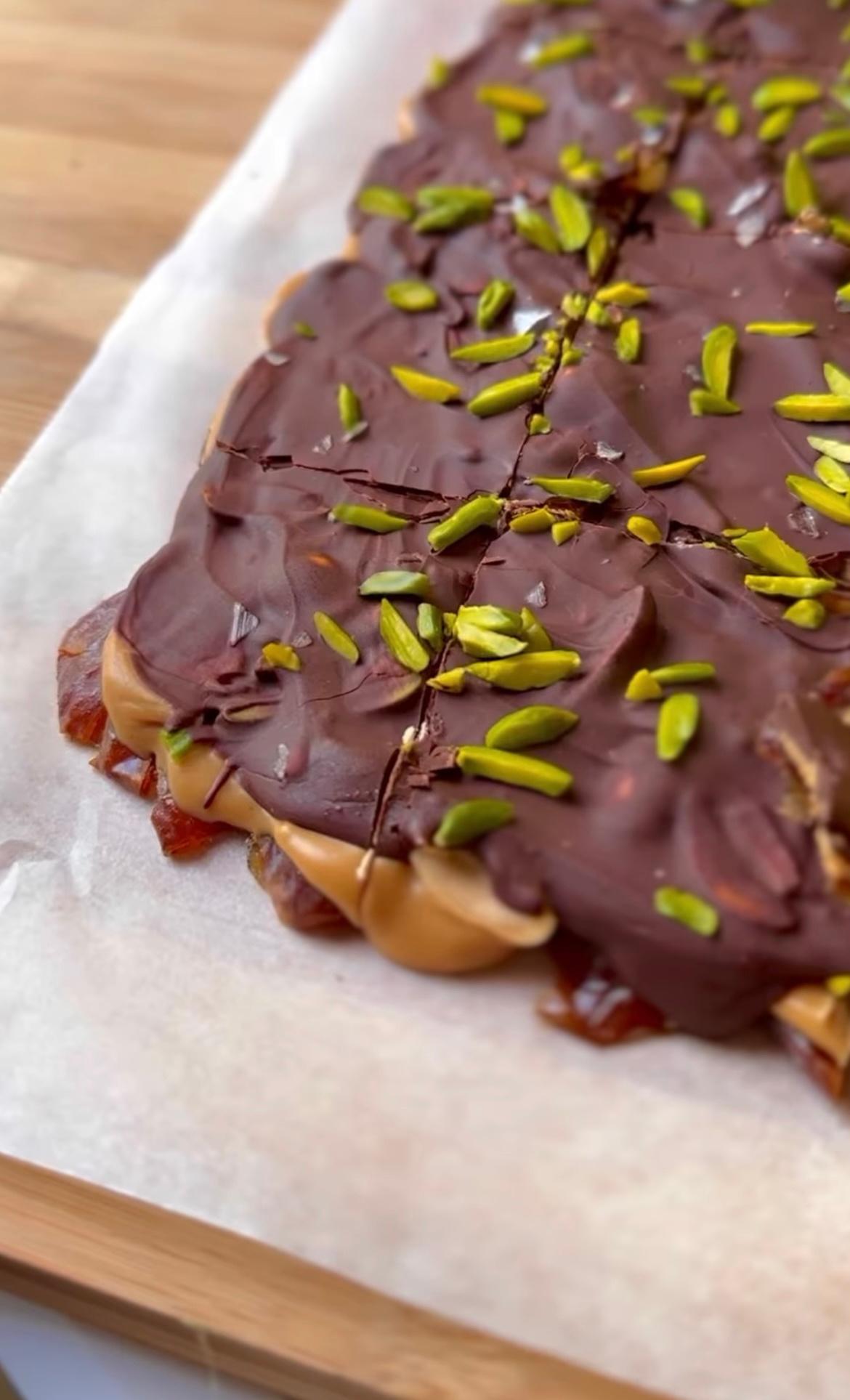 Spread the melted chocolate over along with more nuts and this is a must - some flaky sea salt.