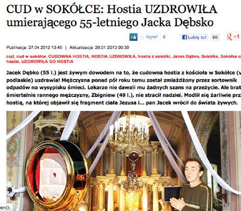 Kiernikowskiego. Niedługo potem z Kongregacji Nauki Wiary przyszła odpowiedź. Watykańska dykasteria uznała, że istnieje moralna i naukowa pewność, iż w kościele św. Jacka doszło do wydarzenia nadprzyrodzonego. 2 lipca cudownie przemieniona cząstka Chleba Eucharystycznego wystawiona została do publicznej adoracji. Proboszcz ks. Andrzej Ziombra mówi, że wobec niezwykłego zjawiska, jakie miało miejsce w jego parafii, nie sposób przejść obojętnie: „Pan Bóg dał nam znak, żeby pobudzić nas poprzez nasze zmysły, wezwać do głębokiej wiary. Pan Bóg nie daje nam żadnych znaków tak sobie, ale daje w konkretnym celu. Myślę, że każdy z nas musi indywidualnie odpowiedzieć sobie na pytanie, co ten znak do niego mówi, jakie jest dla niego przesłanie. Postrzegam to jako szansę, abyśmy przebudzili się i może dokonali nawet rewolucji w naszym życiu. To już jest kwestia otwarta, ale bez wątpienia obok tego znaku nie da się przejść obojętnie”3.