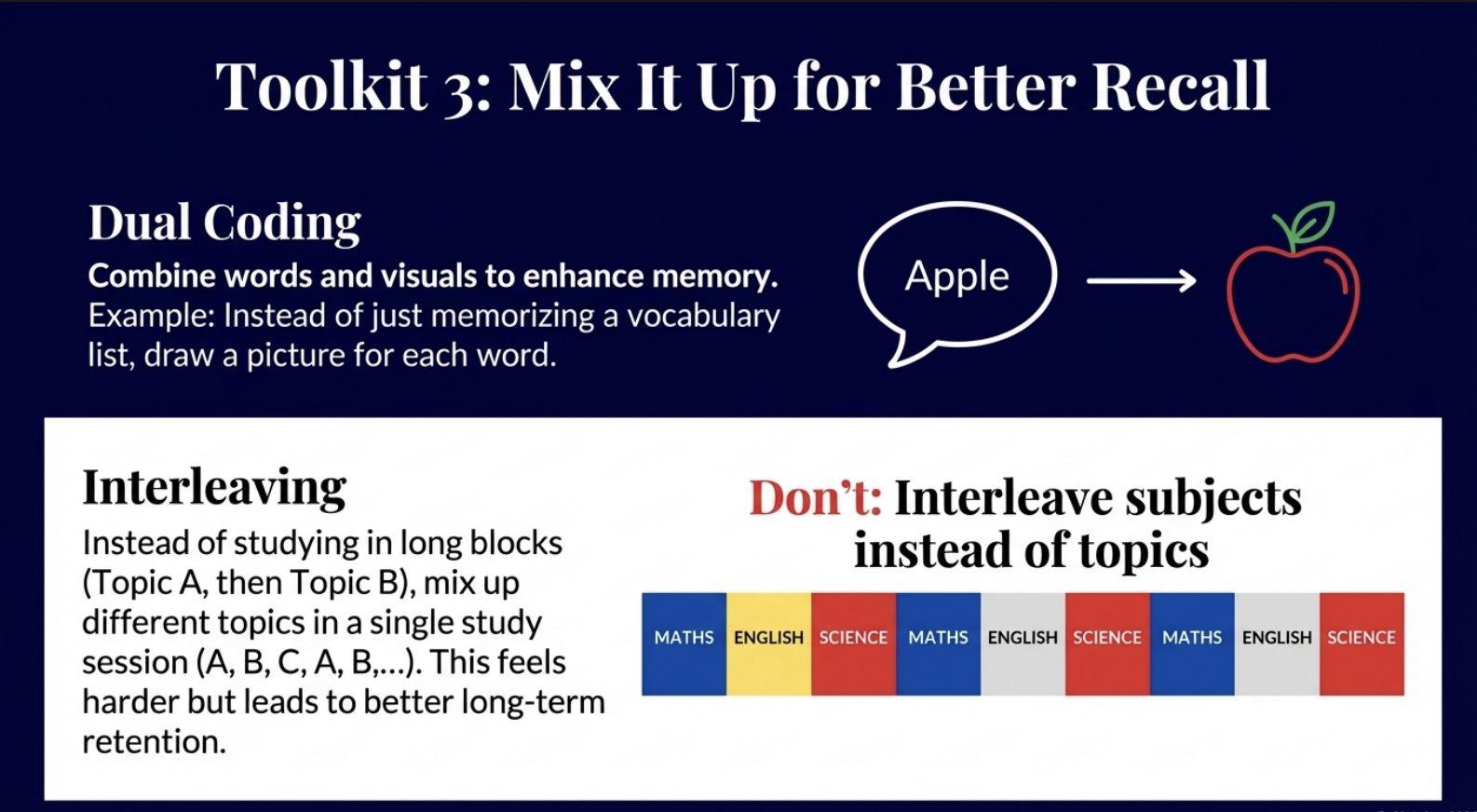 Toolkit 2 - Dual Coding - Mix it Up!One topic/skill/subject in its entiretyFaster initial learningHigher confidence → feels easierMixes/alternates… in one sessionEnhances longer-term retention/exam masteryMore cognitively demandingPromotes deeper engagement…How are we supporting your child’s exam preparation?