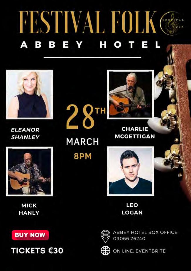 VOLUME: 875 The Local Paper The BIGGEST readership of ANY Roscommon newspaper! Readership is now 80,000 people every week! www.roscommonpeople.ie 01 March 2024 ABBEY STREET, ROSCOMMON Tel. (090) 66 34633 advertising@roscommonpeople.ie news@roscommonpeople.ie sport@roscommonpeople.ie FREE Golf Links Road, Roscommon (090) 66 37620 iles and athrooms SALE NOW ON Wall Tiles from €9.95 per sq. yd. Do you need your domestic appliance repaired? If so contact us! 090 66 34465 tommiekelly.ie TOMMIE KELLY ELECTRICAL Athleague, Roscommon – 090 6663385 ROSCOMMON TOWN – 090 6634465 Byrne Carolan Cunningham LLP Solicitors All Personal Injury Matters: Motor Accidents, Workplace Accidents, Garda Compensation Claims, Medical Accidents 090 647 8433 www.bccsolicitors.ie *In contentious business, a solicitor may not calculate fees or other charges as a percentage or proportion of any award or settlement PERSONAL INJURY 30 years Proudly serving the people of Athlone for 30 years Byrne Carolan Cunningham LLP Solicitors All Personal Injury Matters: Motor Accidents, Workplace Accidents, Garda Compensation Claims, Medical Accidents 090 647 8433 www.bccsolicitors.ie *In contentious business, a solicitor may not calculate fees or other charges as a percentage or proportion of any award or settlement PERSONAL INJURY 30 years Proudly serving the people of Athlone for 30 years MEDICAL ACCIDENTS CONTACT Byrne Carolan Cunningham LLP SOLICITORS Dedicated Medical Negligence Department Proudly serving our clients Contact Byrne Carolan Cunningham LLP Solicitors All Personal Injury Matters: Motor Accidents, Workplace Accidents, Garda Compensation Claims, Medical Accidents 090 647 8433 www.bccsolicitors.ie *In contentious business, a solicitor may not calculate fees or other charges as a percentage or proportion of any award or settlement PERSONAL INJURY Proudly serving the people of Athlone for 30 years Contact Byrne Carolan Cunningham LLP Solicitors All Personal Injury Matters: Motor Accidents, Workplace Accidents, Garda Compensation Claims, Medical Accidents 090 647 8433 www.bccsolicitors.ie *In contentious business, a solicitor may not calculate fees or other charges as a percentage or proportion of any award or settlement PERSONAL INJURY 30 years Proudly serving the people of Athlone for 30 years Mob.: 086 1914565 Michael Fitzmaurice TD Please ring the Constituency Office in advance to make an appointment, tel: 090 66 28479 or email michael.fitzmaurice @oireachtas.ie Michael.Fitzmaurice@Oireachtas.ie Season's Greetings from Henry Street, Roscommon. For all your electrical wiring accessories and lighting supplies Online Shop now live! mgfelect.com P: 090 66 25644 M: 086 4093805 E: info@mgfelect.com J Keane & Sons PARTS & SERVICE Lansboro St, Roscommon T: 090 66 26316 vwjk.ie Lanesboro St., Roscommon T.: 090 66 26315 The Square, Roscommon Tel.: 090 6626270 or 087 6500931 Frances’ Finishing Touches Contact Frances on 087 6500931 Open 9.30 - 6.00 pm New range of Flannelette sheets back in stock! McG UINNESS Pharmacy Main Street, Roscommon T. 090 66 26193 F. 090 66 28789 REVIVE ACTIVE 25% OFF Lubricants Fuel Cards Commercial For the best value on home heating oil and Agri fuels Never run out of oil again with our NEW Oil Monitor! Depot: 090 663 46 45 Jason 087 188 8114 • Joe 087 188 8115 Kevin Ireland 087 221 6127 • Matt Devane 087 188 2288 or online at www.sweeneyoil.ie Depot: 090 663 46 45 • Jason McEvoy: 087 188 8114 • Joe McEvoy: 087 188 8115 • Kevin Ireland: 087 221 6127 • Matt Devane: 087 188 2288 or online at www.sweeneyoil.ie For the best price on fuel Hynes Pharmacy Castle Street, Roscommon. Tel. (090) 66 34147 NEW Senator Seanad Spokesperson CommunityAffairs Rural and the Islands Clinics available at all times. Tel. 087 1668775 Email: eugene.murphy@oireachtas.ie Eugene MURPHY Finn Electrical Goff Street, Roscommon Tel. 090 66 25573 Wards Circular Road, Roscommon town Tel. 090 6626172 Ecoblaze Hardwood Briquettes € 7.99 Pack 12 (10kg) Christy Connolly reCovery CASTLEREA, CO. ROSCOMMON TEL. 094 9620793 MOB. 086 2505325 / 087 2505325 E: christyconnollymotors@gmail.com • Approved recyclers of end of life vehicles • Destruction certs issued • 24/7 recovery service available nationwide Large selection of Kitchen Appliances Great deals now available Call instore and browse Mela B3 SPF30 Anti-dark Spot Corrective CASEY’S ROSCOMMON Contact 090 66 38000 Launch of Drama Festival SEE INSIDE Lights, Camera, Action! All roads lead to Castlebar this Saturday, where Mayo and Roscommon will meet under lights (7.30 pm throw-in) for what promises to be a fascinating NFL Division One encounter. Mayo will be favourites, but Roscommon’s 12-point win over Monaghan last Sunday has breathed much-needed momentum into their campaign. Photo shows Roscommon manager Davy Burke celebrating a score at Dr Hyde Park on Sunday. Pic: Bernie O’Farrell
