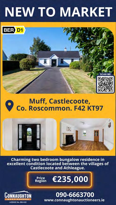 VOLUME: 846 The Local Paper The BIGGEST readership of ANY Roscommon newspaper! Readership is now 80,000 people every week! www.roscommonpeople.ie 04 August 2023 ABBEY STREET, ROSCOMMON Tel. (090) 66 34633 advertising@roscommonpeople.ie news@roscommonpeople.ie sport@roscommonpeople.ie FREE Golf Links Road, Roscommon (090) 66 37620 iles and athrooms Summer Sale Now on Lubricants Fuel Cards Commercial For the best value on home heating oil and Agri fuels Never run out of oil again with our NEW Oil Monitor! Depot: 090 663 46 45 Jason 087 188 8114 • Joe 087 188 8115 Kevin Ireland 087 221 6127 • Matt Devane 087 188 2288 or online at www.sweeneyoil.ie Depot: 090 663 46 45 • Jason McEvoy: 087 188 8114 • Joe McEvoy: 087 188 8115 • Kevin Ireland: 087 221 6127 • Matt Devane: 087 188 2288 or online at www.sweeneyoil.ie For the best price on fuel CASEY’S ROSCOMMON Now Delivering Contact 090 66 38000 Finn Electrical Goff Street, Roscommon Tel. 090 66 25573 TOMMIE KELLY ELECTRICAL Athleague, Roscommon – 090 6663385 ROSCOMMON TOWN – 090 6634465 J Keane & Sons PARTS & SERVICE Lansboro St, Roscommon T: 090 66 26316 vwjk.ie Lanesboro St., Roscommon T.: 090 66 26315 COMPULSORY PURCHASE ORDER Byrne Carolan Cunningham LLP Mob.: 086 1914565 Michael Fitzmaurice TD Please ring the Constituency Office in advance to make an appointment, tel: 090 66 28479 or email michael.fitzmaurice @oireachtas.ie Michael.Fitzmaurice@Oireachtas.ie Do you need your domestic appliance repaired? If so contact us! 090 66 34465 tommiekelly.ie Large selection of Dryers in stock! McG UINNESS Pharmacy Main Street, Roscommon T. 090 66 26193 F. 090 66 28789 Revive Active 30s 25% OFF HEGARTY Plant Hire Call for more info on 087 2536428 or 086 6676424 Keen Rates For Hire of Micro-12t Digger, Dumpers, Rollers, Teleporter, Rock Breakers and Hedgecutter The Square, Roscommon Tel.: 090 6626270 or 087 6500931 Frances’ Finishing Touches Contact Frances on 087 6500931 Open 9.30 - 6.00 pm We supply & fit all ranges of Blinds Abbey Street, Roscommon T: (090) 6627498 F: (090) 6665590 E: info@liddyneilan.ie Practice areas include: Conveyancing Family Law Probate, Wills & Estate Planning • Personal Injury Claims and Litigation* Liddy NeiLaN LLP *in contentious business, a solicitor may not calculate fees or other charges as a percentage or proportion of any award or settlement. Hynes Pharmacy Castle Street, Roscommon. Tel. (090) 66 34147 Henry Street, Roscommon. For all your electrical wiring accessories and lighting supplies Look out for our new Online Store www.mgfelect.com Wards CIRCULAR ROAD, ROSCOMMON TOWN TEL. 090 6626172 Corby Rock Layers Pellets & Layers Mash 20kg Bag €10.95 Assorted Gift Packs now in stock 087 2223368 Email: roscommonbouncycastles@gmail.com Out & About SEE INSIDE CIAN’S CALL! Connacht rugby player Cian Prendergast is appealing to Roscommon people to support the Alzheimer’s Memory Walk for 2023, which will take place in over 30 locations nationwide – including in Roscommon – on Sunday, September 24th. Cian is pictured with sisters Doireann (8) and Róise (6) Brennan at the launch of the Salthill Prom Memory Walk. For more, see memorywalk.ie and also page 36 inside. Pic: Andrew Downes, xposure.