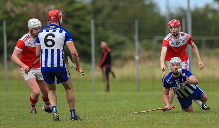 Cian Martin loses his footing but still manages to get a hand pass away to brother Jason during last weekend’s Kepak Senior Hurling Championship match between St Dominic’s and Pádraig Pearses at Athleague.