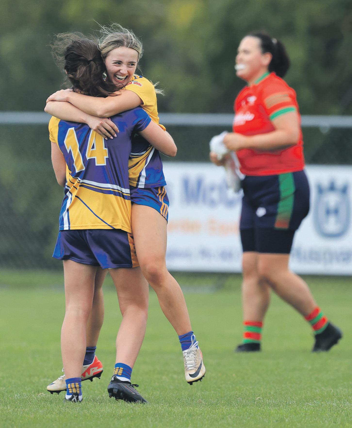 Ruth Finlass and Mia Macken celebrate at the final whistle as Clann na nGael defeated St Brigid’s in last Saturday’s Roscommon LGFA Senior final. Photo: Bernie O’Farrell