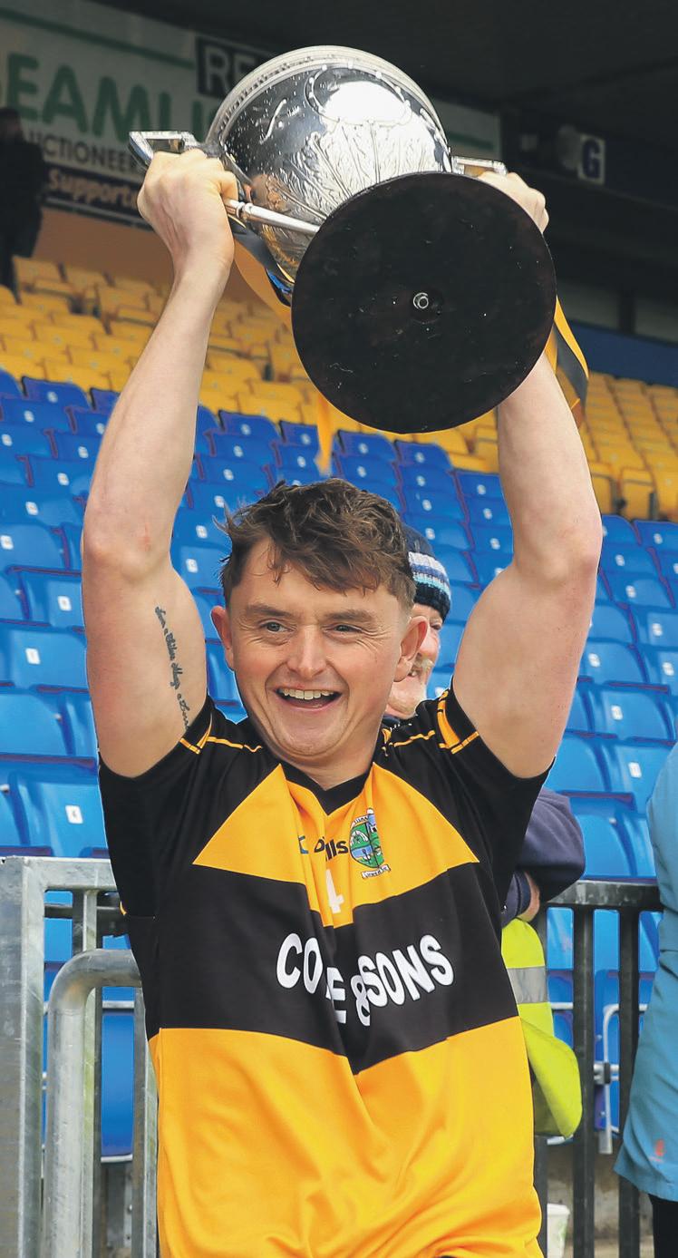 Four Roads captain Conor Coyle lifts the Mickey Cunniffe Cup aloft after his team completed a three-in-a-row at Dr Hyde Park last Sunday. Photo: Bernie O’Farrell