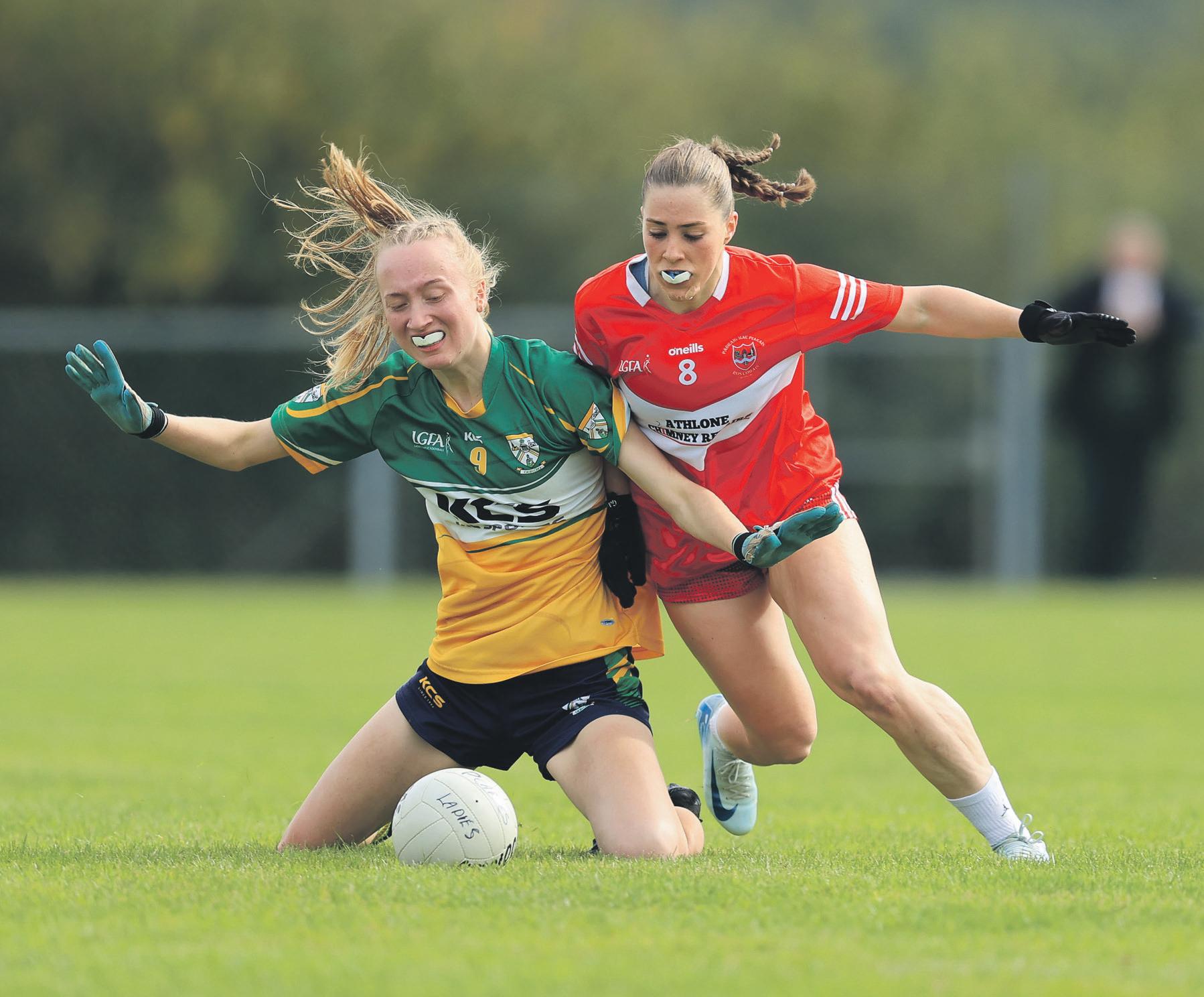 Action from last Saturday’s Roscommon LGFA Junior B final in which Castlerea St Kevin’s defeated Four Roads by 2-17 to 0-3. Abi Flanagan (Castlerea) and Ruth Gannon (Four Roads) are pictured. Photo: Bernie O’Farrell