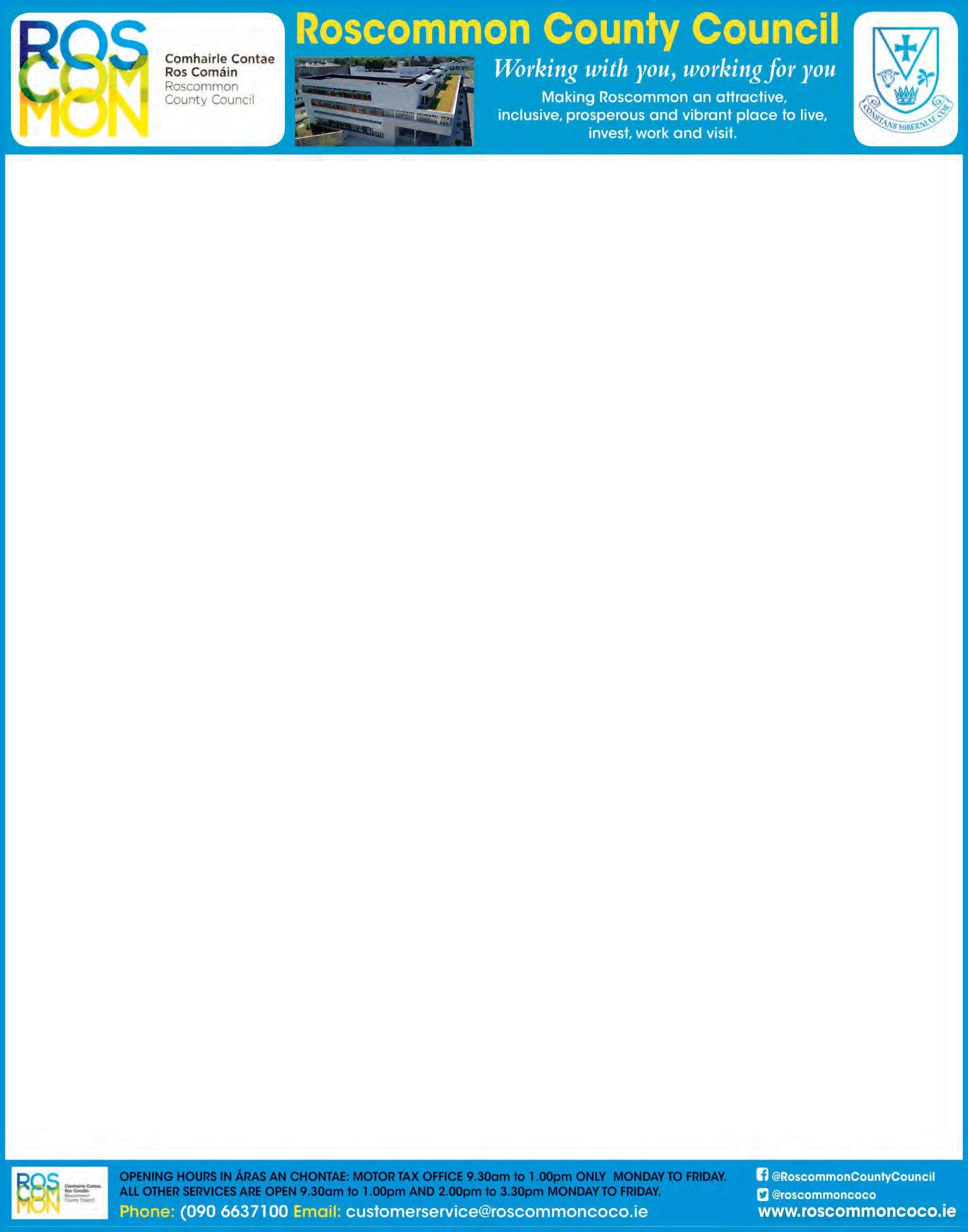 Finn Electrical Goff Street, Roscommon Tel. 090 66 25573 VOLUME: 804The Local Paper The BIGGEST readership of ANY Roscommon newspaper! Readership is now 80,000 people every week! www.roscommonpeople.ie 07 October 2022 ABBEY STREET, ROSCOMMON Tel. (090) 66 34633 advertising@roscommonpeople.ie news@roscommonpeople.ie sport@roscommonpeople.ie FREE Golf Links Road, Roscommon (090) 66 37620 iles and athrooms SALE NOW ON Mob.: 086 1914565 Michael Fitzmaurice TD Please ring the Constituency Office in advance to make an appointment, tel: 090 66 28479 or email michael.fitzmaurice @oireachtas.ie Michael.Fitzmaurice@Oireachtas.ie J Keane & Sons PARTS & SERVICE Lansboro St, Roscommon T: 090 66 26316 vwjk.ie Lanesboro St., Roscommon Learn to drive with Roscommon Driving School 087 2295551 TOMMIE KELLY ELECTRICAL Athleague, Roscommon – 090 6663385 ROSCOMMON TOWN – 090 6634465 www.tommiekelly.ie HEGARTY Plant Hire Call for more info on 087 2536428 or 086 6676424 Self-drive Hire of Excavators from 1 tonne to 13 tonne Dumpers, Rollers, Teleporters, Hoists, Cherry Pickers, etc. Daily/Weekly/Monthly rate options available DELIVERY AVAILABLE NATIONWIDE LubricantsFuel CardsCommercial For the best value on home heating oil and Agri fuels Never run out of oil again with our NEW Oil Monitor! Depot: 090 663 46 45 Jason 087 188 8114 • Joe 087 188 8115 Kevin Ireland 087 221 6127 • Matt Devane 087 188 2288 or online at www.sweeneyoil.ie Depot: 090 663 46 45 • Jason McEvoy: 087 188 8114 • Joe McEvoy: 087 188 8115 • Kevin Ireland: 087 221 6127 • Matt Devane: 087 188 2288 or online at www.sweeneyoil.ie For the best price on fuel The Square, Roscommon Frances’ Finishing Touches Contact Frances on 087 6500931 Open 9.30 - 6.00 pm KEEP THE HEAT IN WITH OUR THERMAL LINED CURTAINS! GREAT DEALS ON LAPTOPS Abbey Street, Roscommon T: (090) 6627498 F: (090) 6665590 E: info@liddyneilan.ie *in contentious business, a solicitor may not calculate fees or other charges as a percentage or proportion of any award or settlement. Practice areas include: • Conveyancing • Family Law • Probate, Wills & Estate Planning • Personal Injury Claims and Litigation* Liddy NeiLaN LLP Wards CIRCULAR ROAD, ROSCOMMON TOWN TEL. 090 6626172 Large range of Laptops for back to school or college Hynes Pharmacy Castle Street, Roscommon. Tel. (090) 66 34147 CASEY’S ROSCOMMON Now Delivering Contact 090 66 38000 AUTUMN LAWNFEED Treats 750 M2 15kg Bag €25.95 McG UINNESS Main Street, Roscommon T. 090 66 26193 F. 090 66 28789 PROTECT YOURSELF AND OTHERS THIS FLU SEASON DON'T FORGET YOUR FLU VACCINATION FLU VACCINATION NOW AVAILABLEBookings Available PROPERTY MAINTENANCE Contact Byrne Carolan Cunningham LLP Solicitors If you have received or are concerned that you are going to be affected by a Compulsory Purchase Order COMPULSORY PURCHASE ORDER Contact Byrne Carolan Cunningham LLP Solicitors If you have received or are concerned that you are going to be affected by a Compulsory Purchase Order COMPULSORY PURCHASE ORDER www.bccsolicitors.ie 090 647 8433 In contentious business, a solicitor may not calculate fees or other charges as a percentage or proportion of any award or settlement MOTOR ACCIDENTS If you were involved in an accident that was not your fault contact Byrne Carolan Cunningham Solicitors ATHLONE MOATE LANESBOROUGH GALWAY www.bccsolicitors.ie 090 647 8433 In contentious business, a solicitor may not calculate fees or other charges as a percentage or proportion of any award or settlement PROPERTY TRANSACTIONS Contact our Property Department in Byrne Carolan Cunningham Solicitors for advice on property sales and purchases ATHLONE MOATE LANESBOROUGH GALWAY www.bccsolicitors.ie 090 647 8433 * In contentious business, a solicitor may not calculate fees or other charges as a percentage or proportion of any award or settlement PROPERTY TRANSACTIONS Contact our Property Department in Byrne Carolan Cunningham Solicitors for advice on property sales and purchases ATHLONE MOATE LANESBOROUGH GALWAY *In contentious business, a solicitor may not calculate fees or other charges as a percentage or proportion of any award or settlement 090 647 8433 • www.bccsolicitors.ie * In contentious business, a solicitor may not calculate fees or other charges as a percentage or proportion of any award or settlement Hilary’s Acupuncture, Homeopathy & Reflexology L.Ac., HOM, NAT, B.A., P.G.C.E. Acupuncturist, Homeopath & Naturopath Tel. 087 91 91364 Email: hilo944@yahoo.co.uk Jamestown, Clondra, Co. Longford www.hilarysacupuncture.ie In Store Promotion NOW ON
