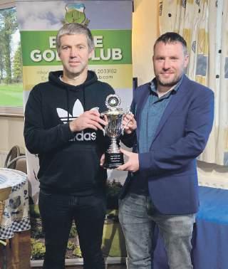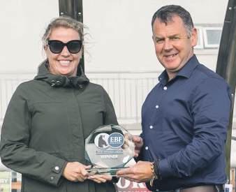 Orrin Burgess is presented with the Michael Moore Car Sales Man of the Match award by Buccaneers President Lorna Stuart Trainor.