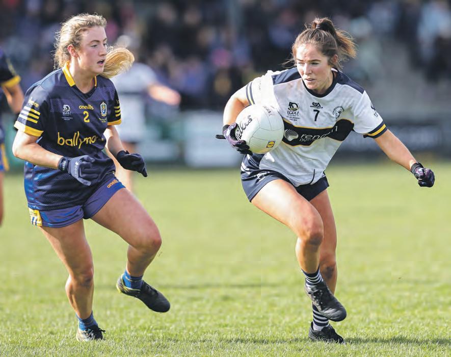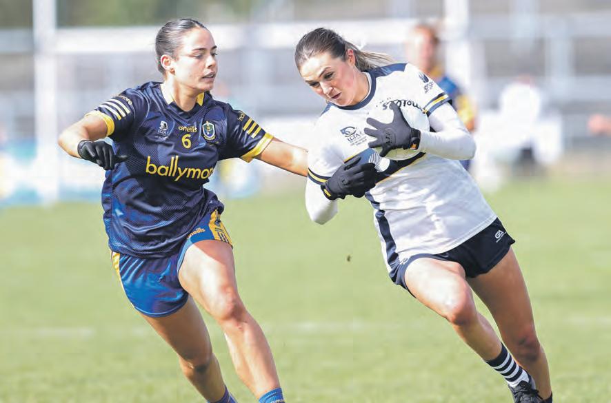 Roscommon’s Saoirse Wynne closes down Clare’s Fidelma Marrinan during the Ladies NFL Division Three nal last Saturday at St Brendan’s Park in Birr. Pic: Bernie O’Farrell