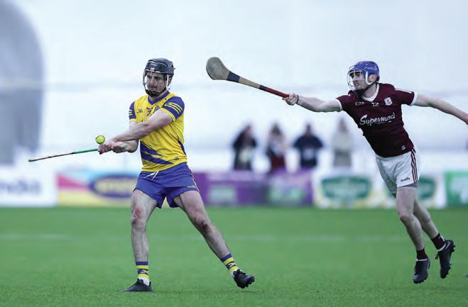 Roscommon’s Joe Brennan gets his strike away as Seán Joyce from Galway Development attempts to block his shot during last Saturday’s Connacht Hurling League Final held at the Connacht GAA Air Dome. Pic: Bernie O’Farrell