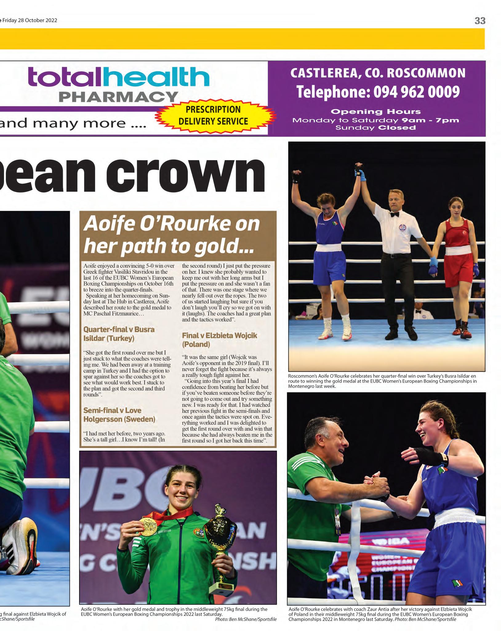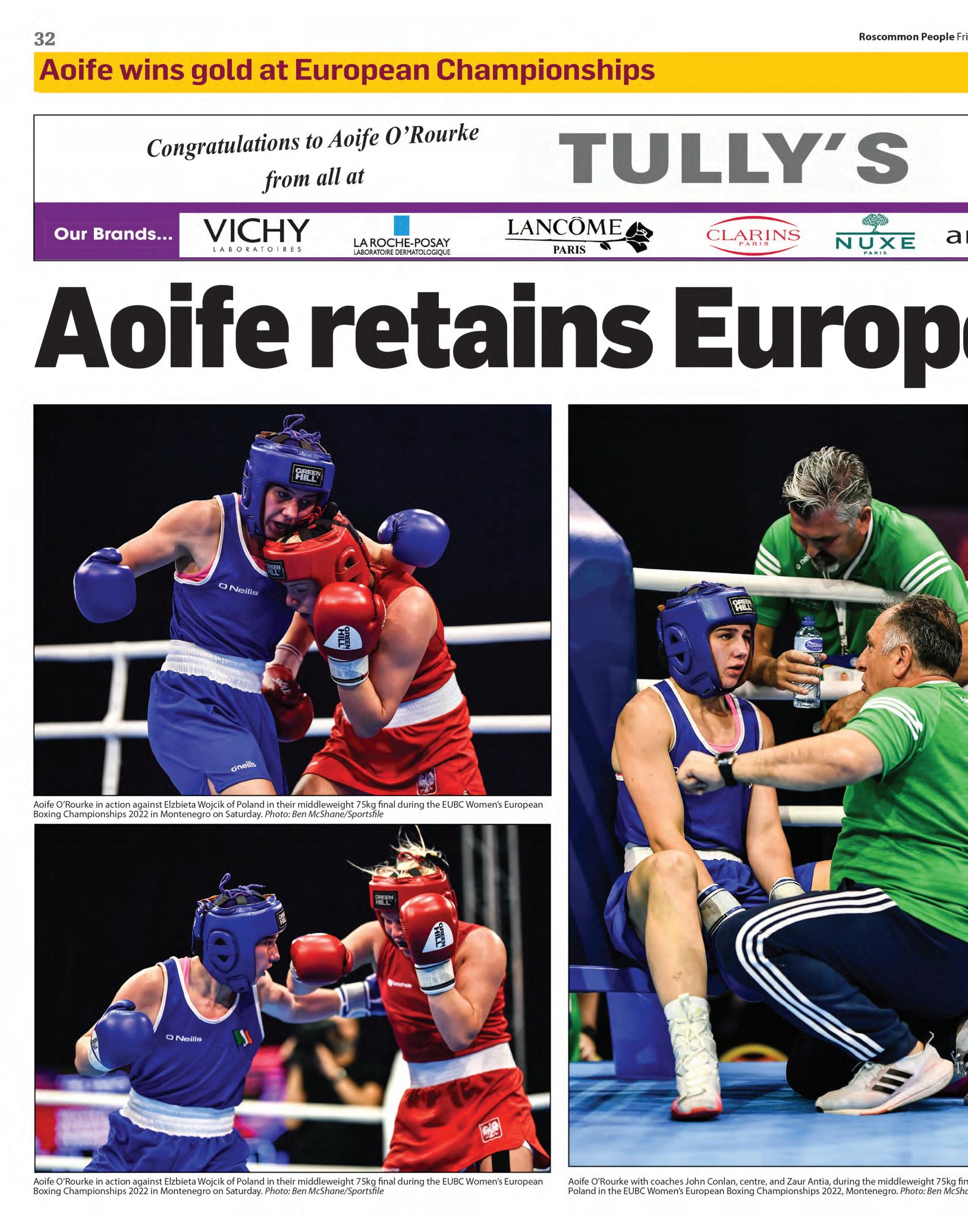 Aoife O’Rourke successfully defended her Euro pean Middleweight Boxing title by winning gold in Montenegro, continuing the sensational run of form of the Castlerea siblings (her sister, Lisa, won a world title earlier this year)