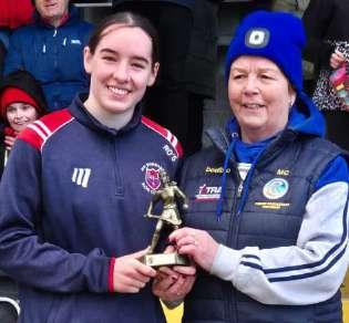 Róisín O’Sullivan (Pádraig Pearses) was awarded player of the match for her outstanding performance in the recent Roscommon Junior A Camogie final. Making the presentation is County Board Secretary Marion Conway.