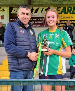 Oran’s Aoife Conneely was awarded player of the match for her performance in the recent Roscommon Junior Camogie B final. County Chairperson Kieran Kenny made the presentation.