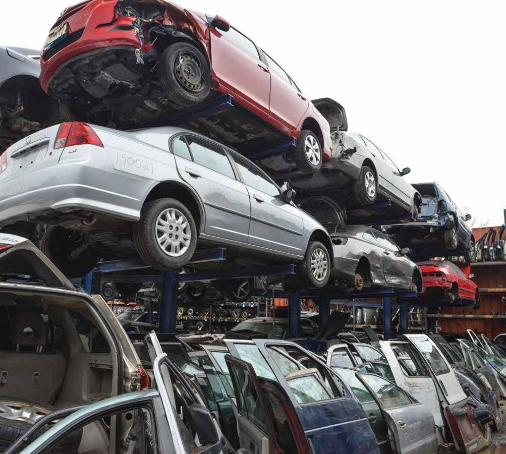 Dexco Salvage Yard Racks provide vertical storage capacity on high-strength arms designed to accommodate recycled automobiles and scrap metal materials on single- or double-sided columns. A horizontal base helps stabilize the structure and supports the bottom load. Cars can be stored up to four levels high, yielding four times the storage capacity in the same available space. This type of storage system offers many advantages including: