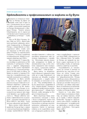 ариерата на генералния секретар на Ротари Ед Фута ще направи пълен кръг в края на юни с оттеглянето му от поста на главен изпълнителен директор на Ротари Интернешънъл и Фондация Ротари. "Когато напусна Секретариата, ще се издигна до най-високия ранг в организацията – доброволец на Ротари“ – казва Фута. Член на РК Ийст Хонолулу, Хавай, САЩ, от 1979 г., Фута служи като дистрикт гуверньор, регионален координатор на Фондация Ротари и представител на Законодателния съвет. Става част от персонала на РИ като мениджър в Отдела за стратегическо планиране, а по-късно е директор по комуникациите. Избран е за генерален секретар през 2000 г. През последните 11 години Фута отговаря за работата на 550 служители в централата в Евънстън и седемте международни офиса на РИ, които подпомагат работата на 1.2 милиона ротарианци в 34 000 клуба по света. По време на цялата си кариера в Ротари Ед с последователност подчертава значението на службата. Мандатът на Фута започва след почти 10 години служба на различни позиции в офисите на генералния секретар и главния финансов директор на РИ. Колегите и лидерите на Ротари са съгласни, че той е помогнал на организацията да премине през трудните времена и да подобри работата си. "Имаше известни проблеми с ефективността на разходите – припомня президентът на РИ за 1996-97 г. Луис Жией. – Ед бе отличен навигатор през бурите". Фута назначи новия финансов директор Питър де Бърг и заедно с него успя да балансира бюджета, изгради приемственост във Фи-