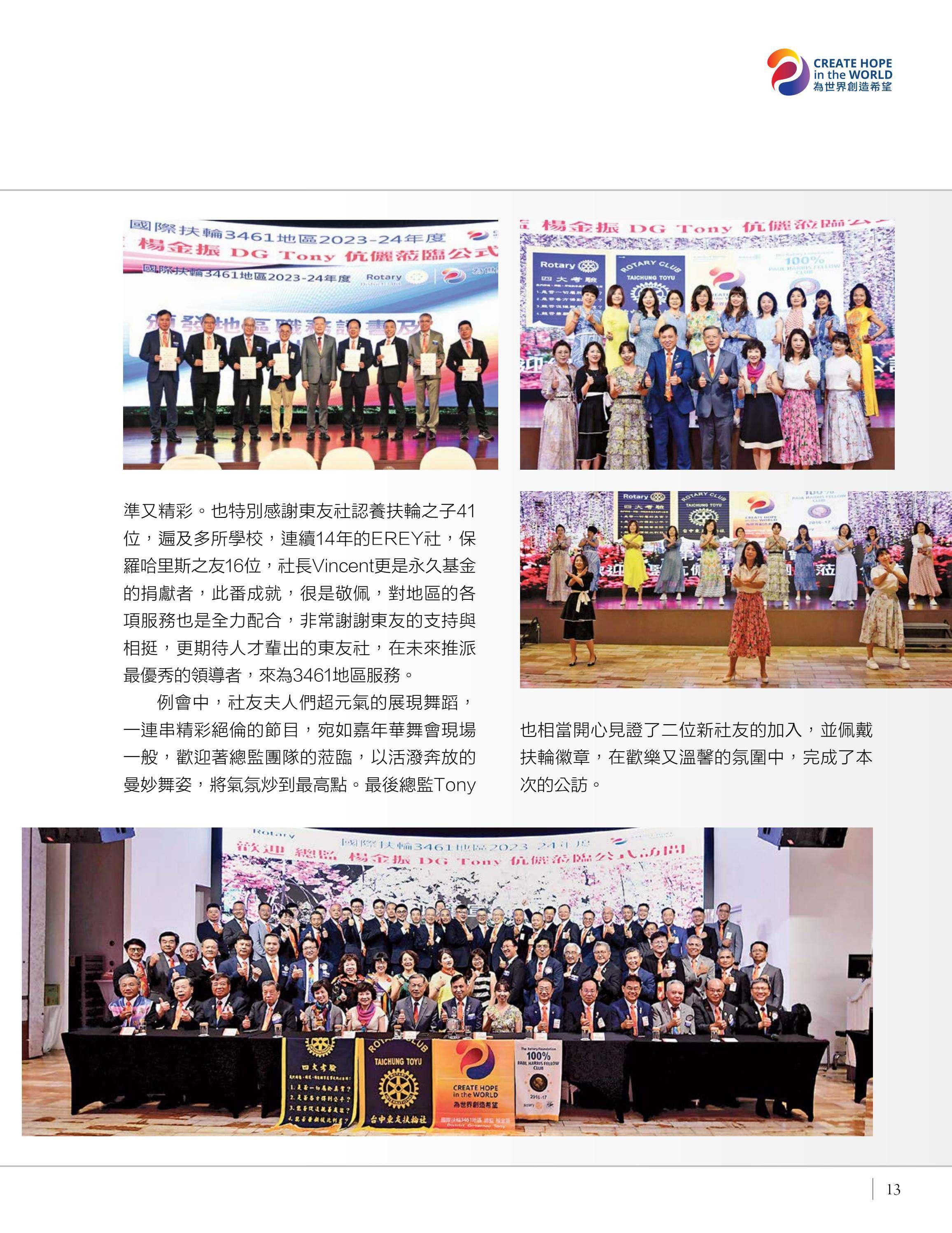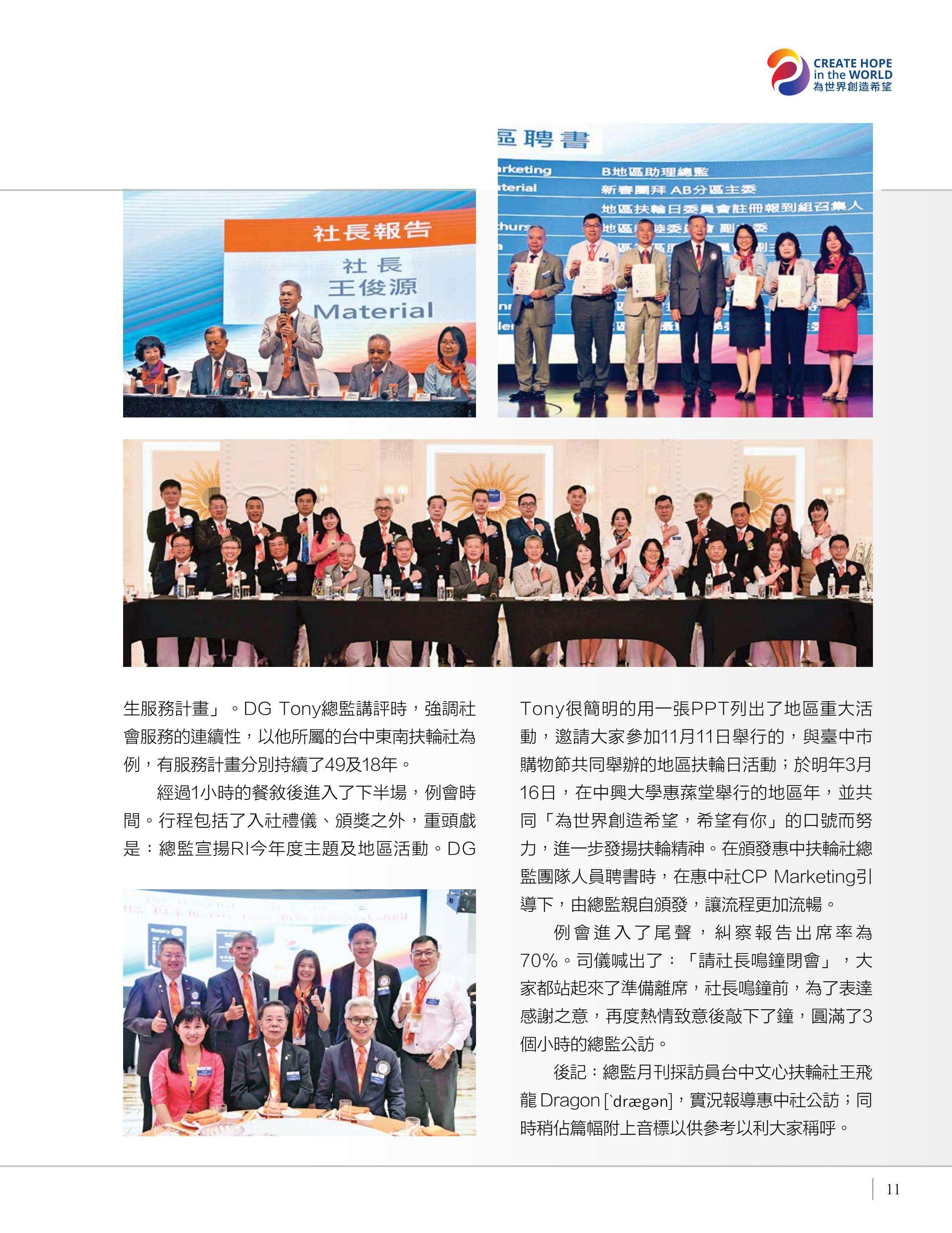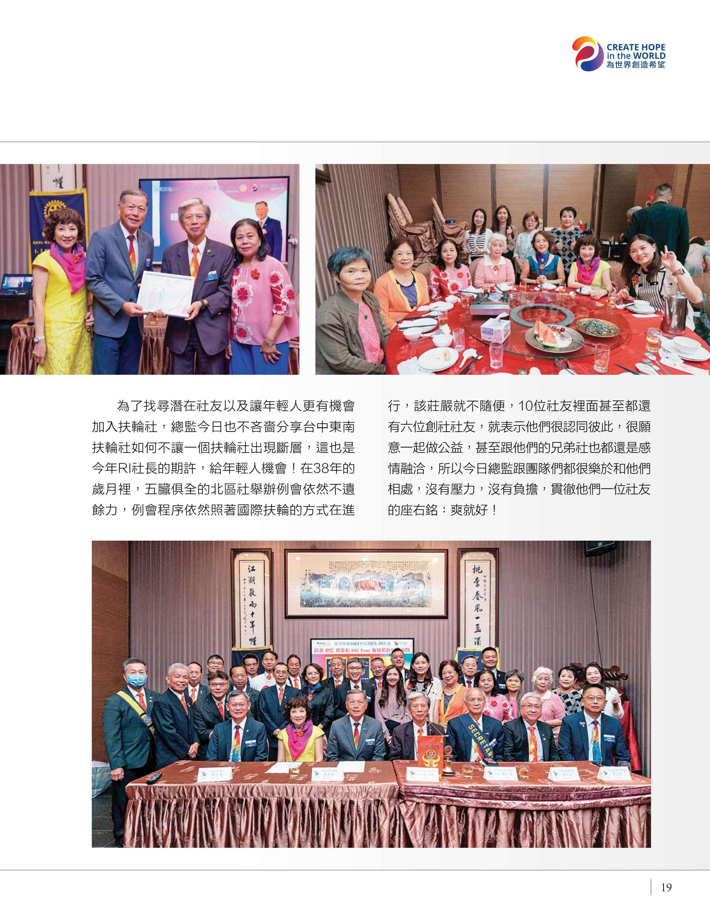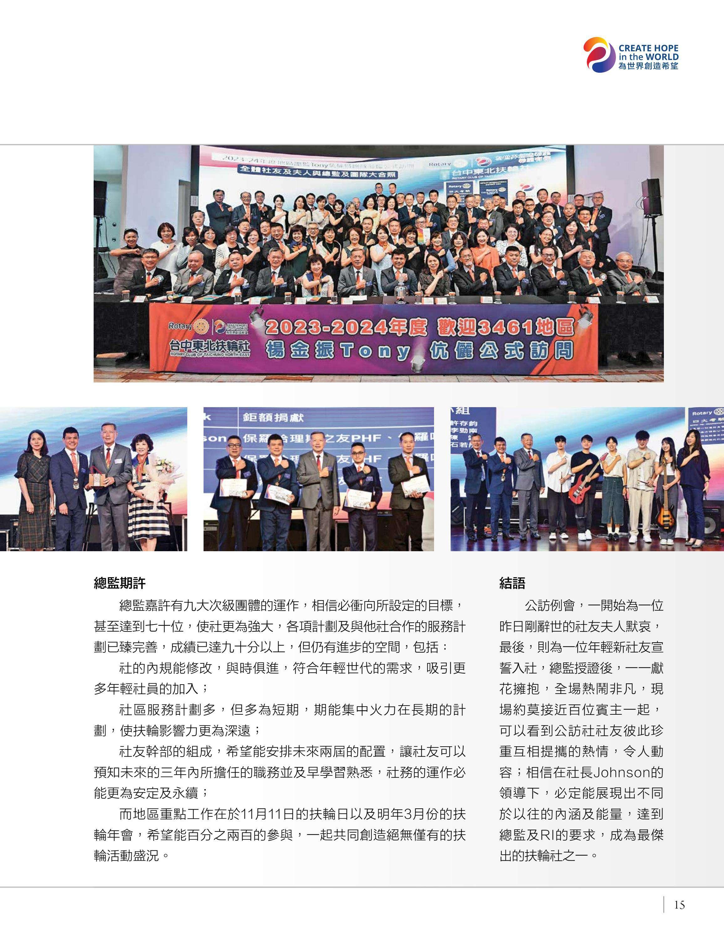 總監公訪走訪台中中興、豐原富春、台中惠中、東友、東北、神岡、港北區、豐原、后里及大甲扶輪社,由馮宏雲、于芷卉、王飛龍等社員記錄各地社團的熱情故事,展現3461地區的多元風采。台中向上扶輪社第六屆社長就職暨梨山復建計畫捐贈儀式由賴育生分享,彰顯服務與傳承。台中馬拉松社就職典禮由卓秋季記錄,象徵新年度的接棒,**台灣四東會「雄嘛吉!港都搖滾之夜」**由簡本昌呈現,點燃跨社團的熱情。