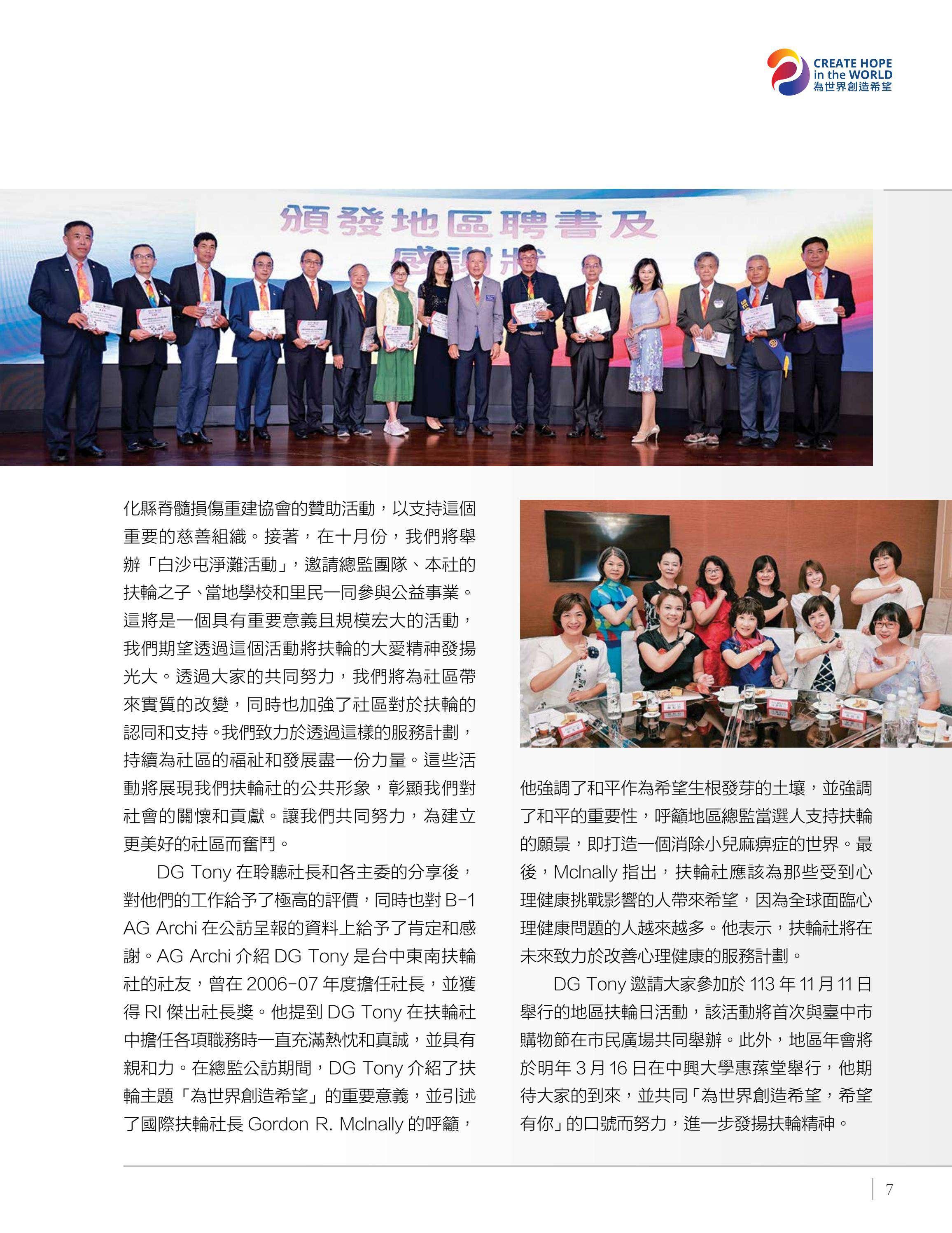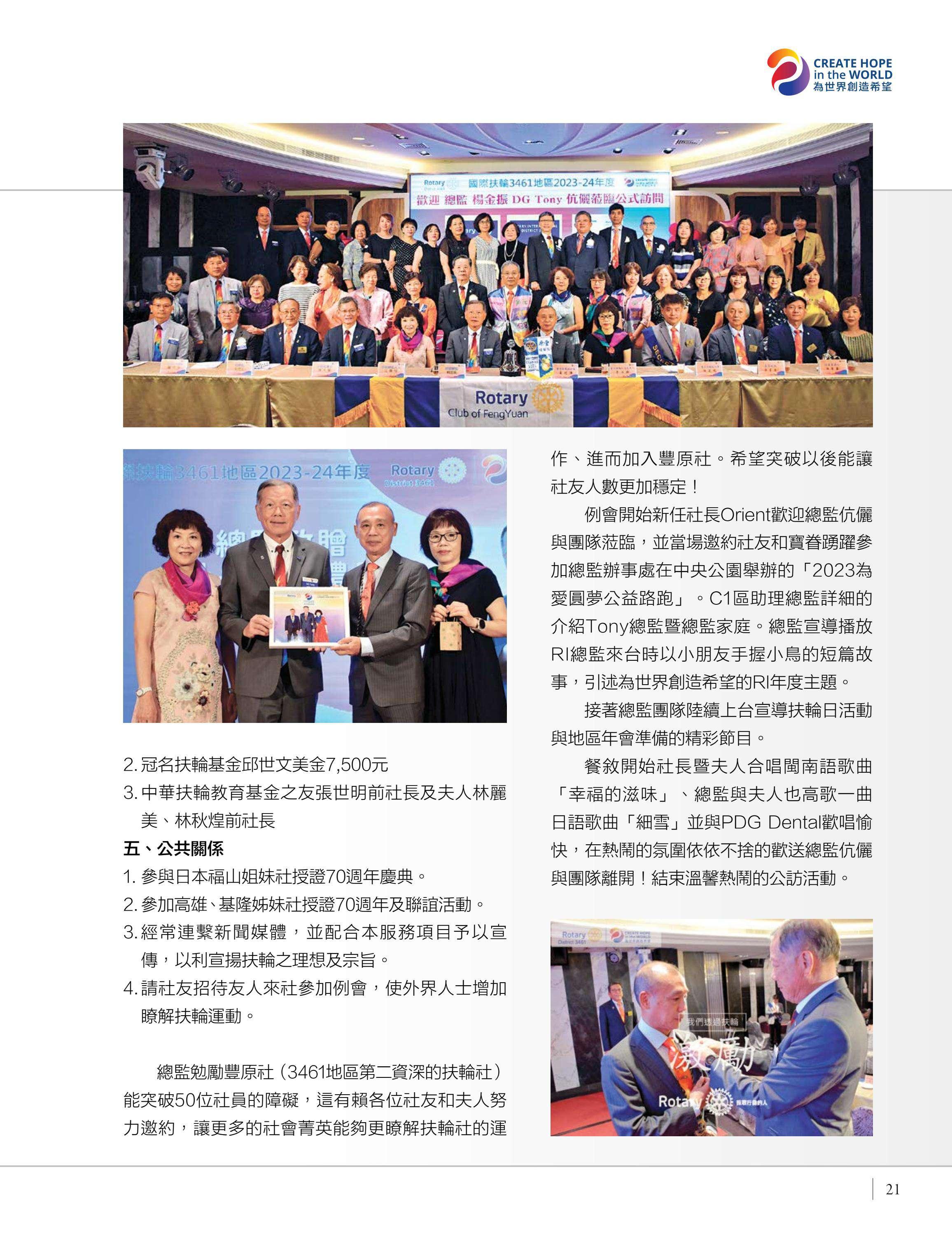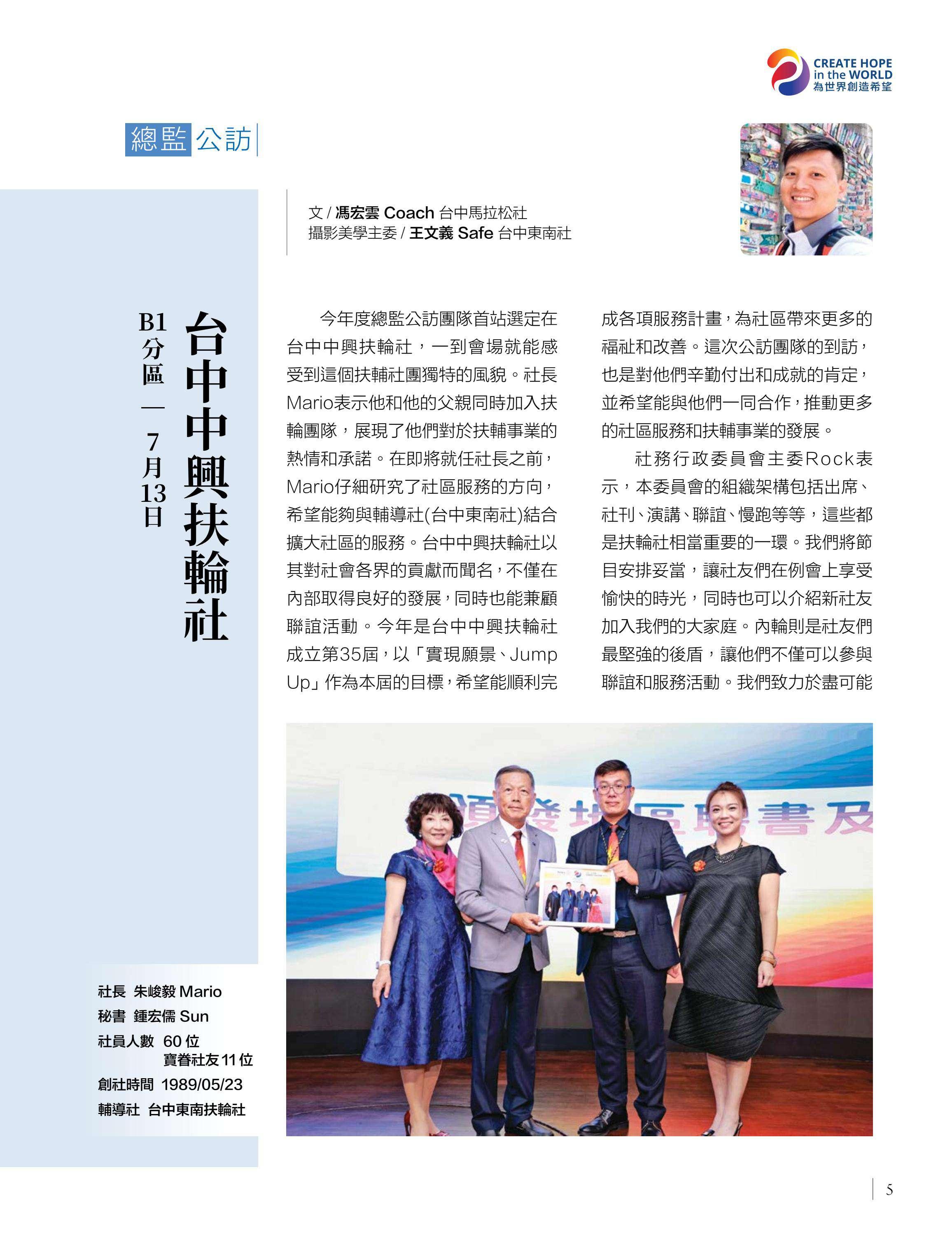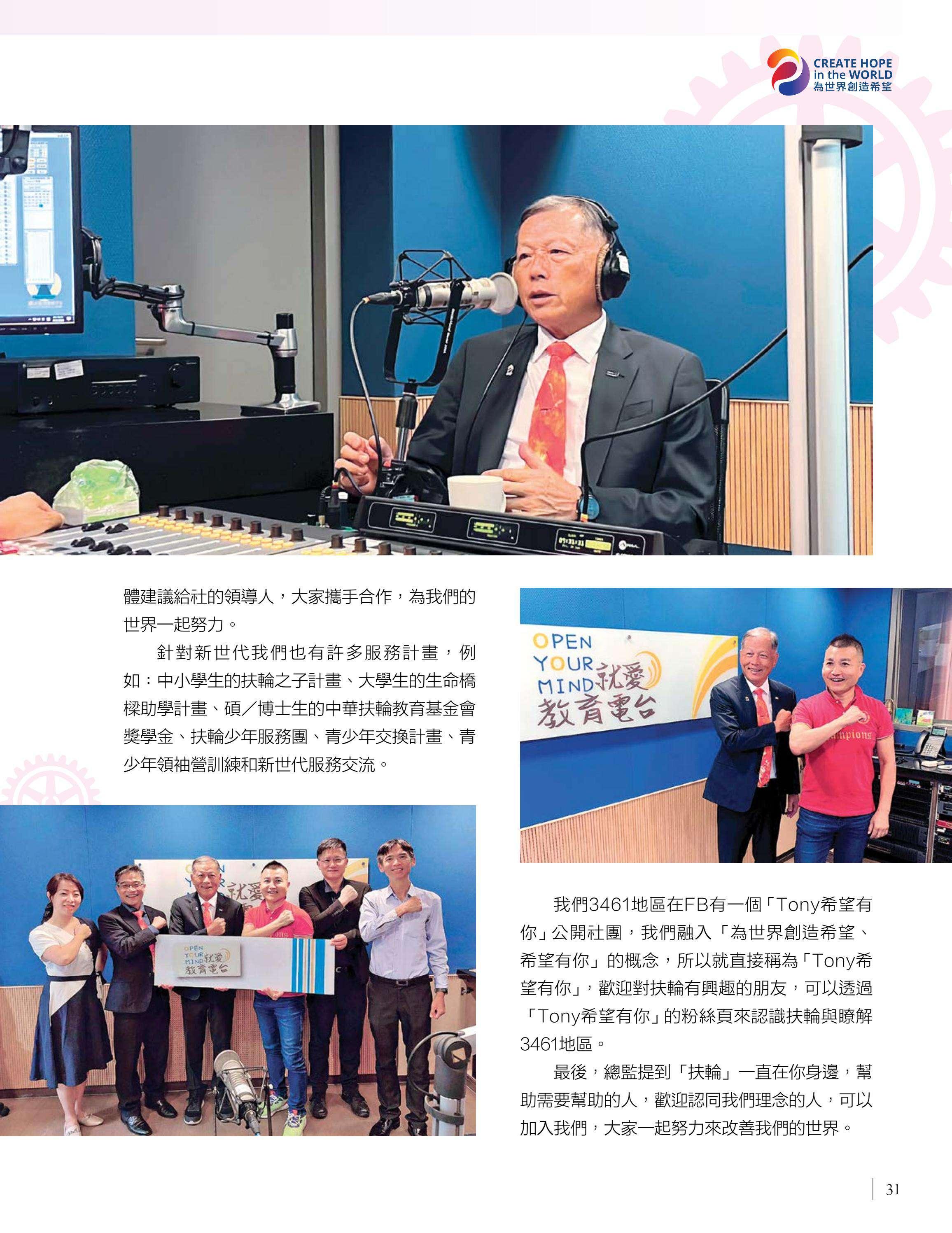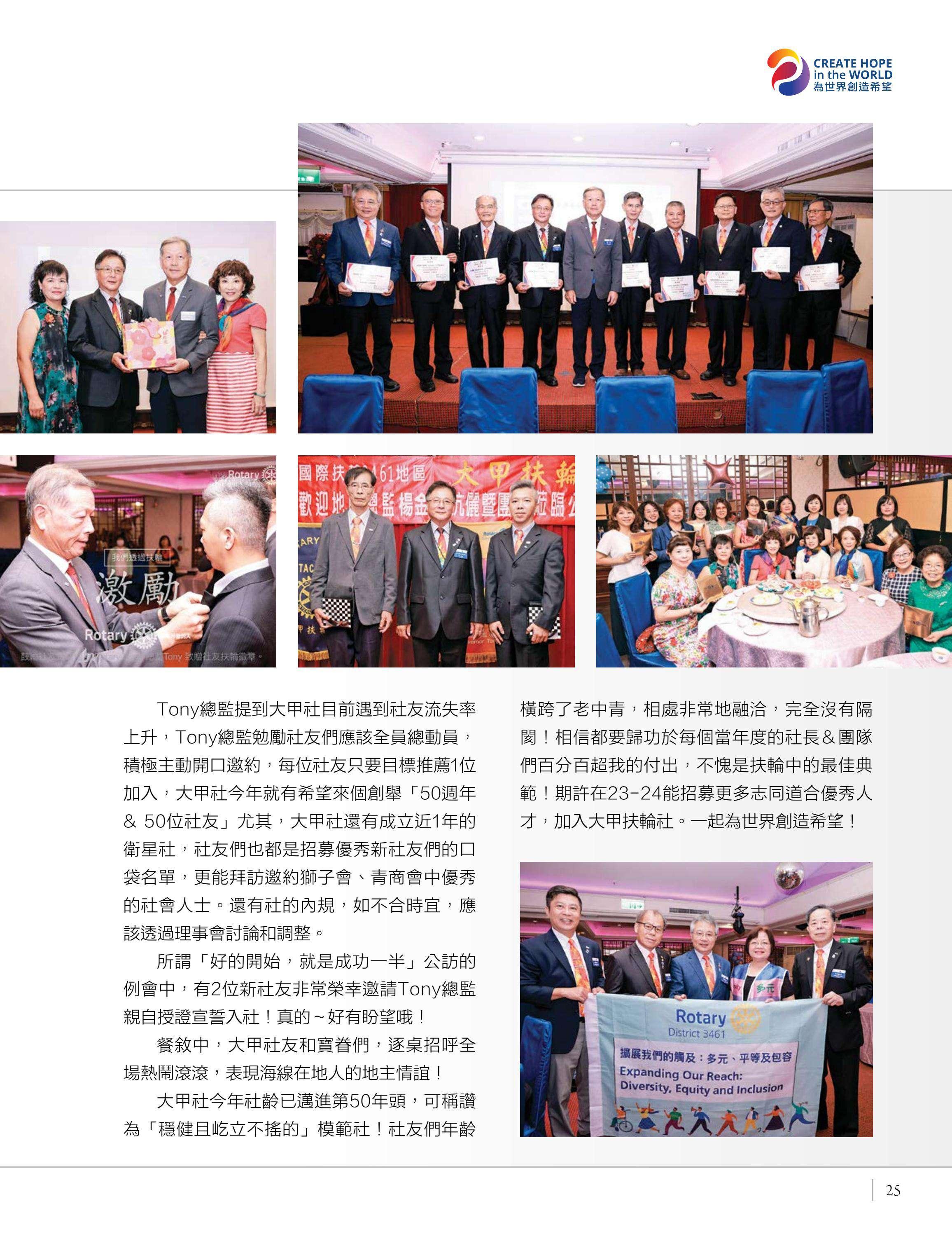 總監公訪走訪台中中興、豐原富春、台中惠中、東友、東北、神岡、港北區、豐原、后里及大甲扶輪社,由馮宏雲、于芷卉、王飛龍等社員記錄各地社團的熱情故事,展現3461地區的多元風采。台中向上扶輪社第六屆社長就職暨梨山復建計畫捐贈儀式由賴育生分享,彰顯服務與傳承。台中馬拉松社就職典禮由卓秋季記錄,象徵新年度的接棒,**台灣四東會「雄嘛吉!港都搖滾之夜」**由簡本昌呈現,點燃跨社團的熱情。