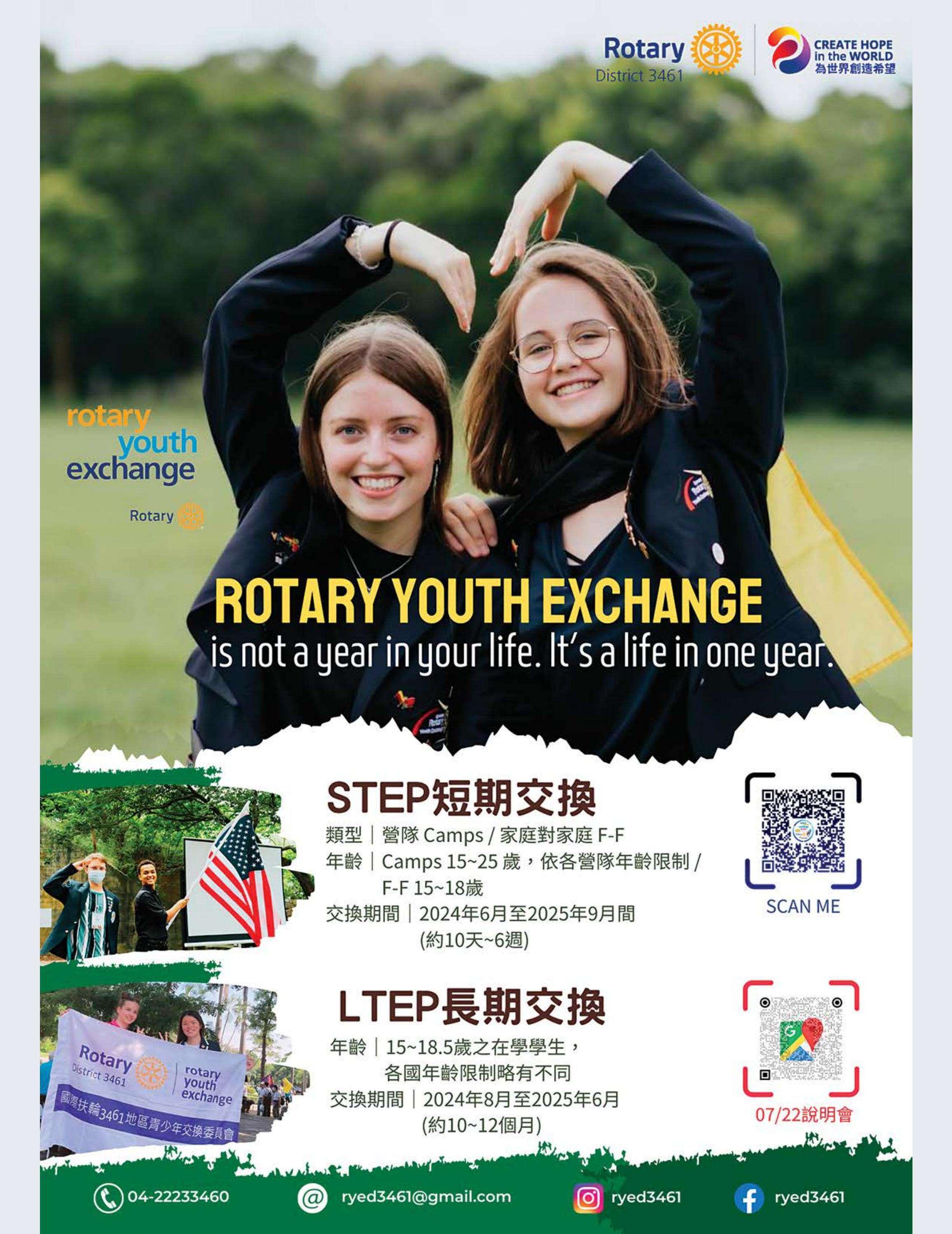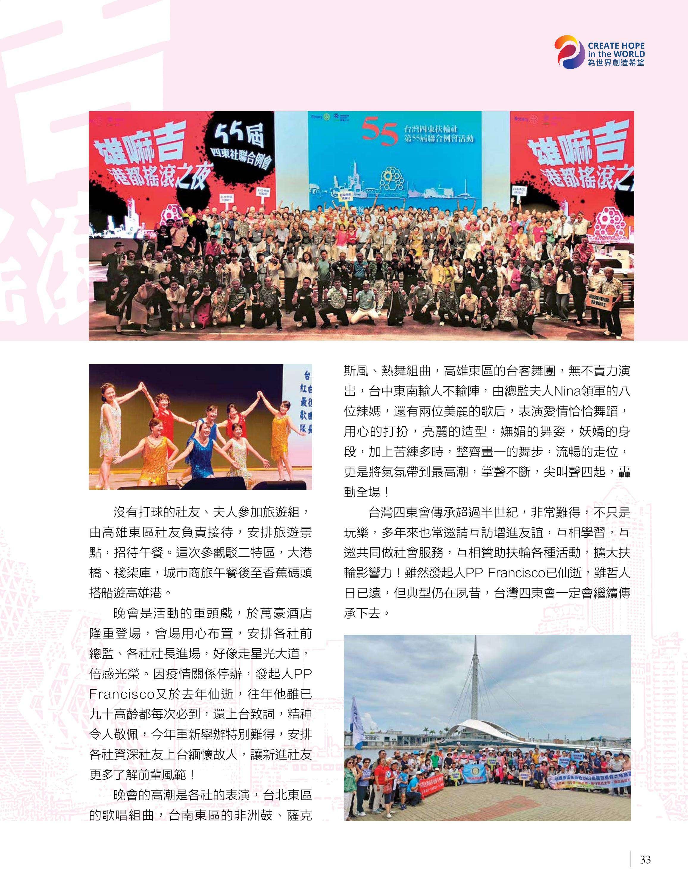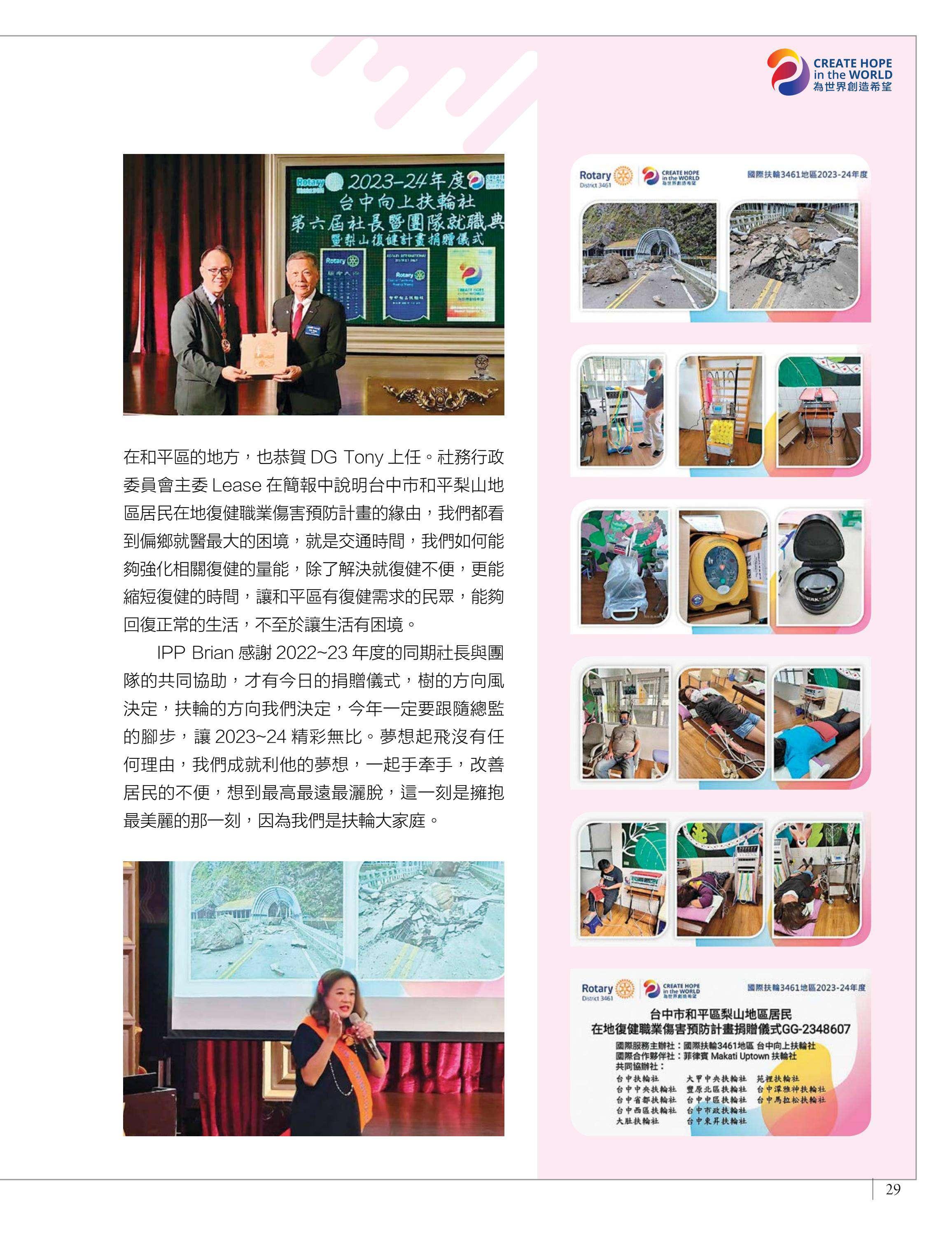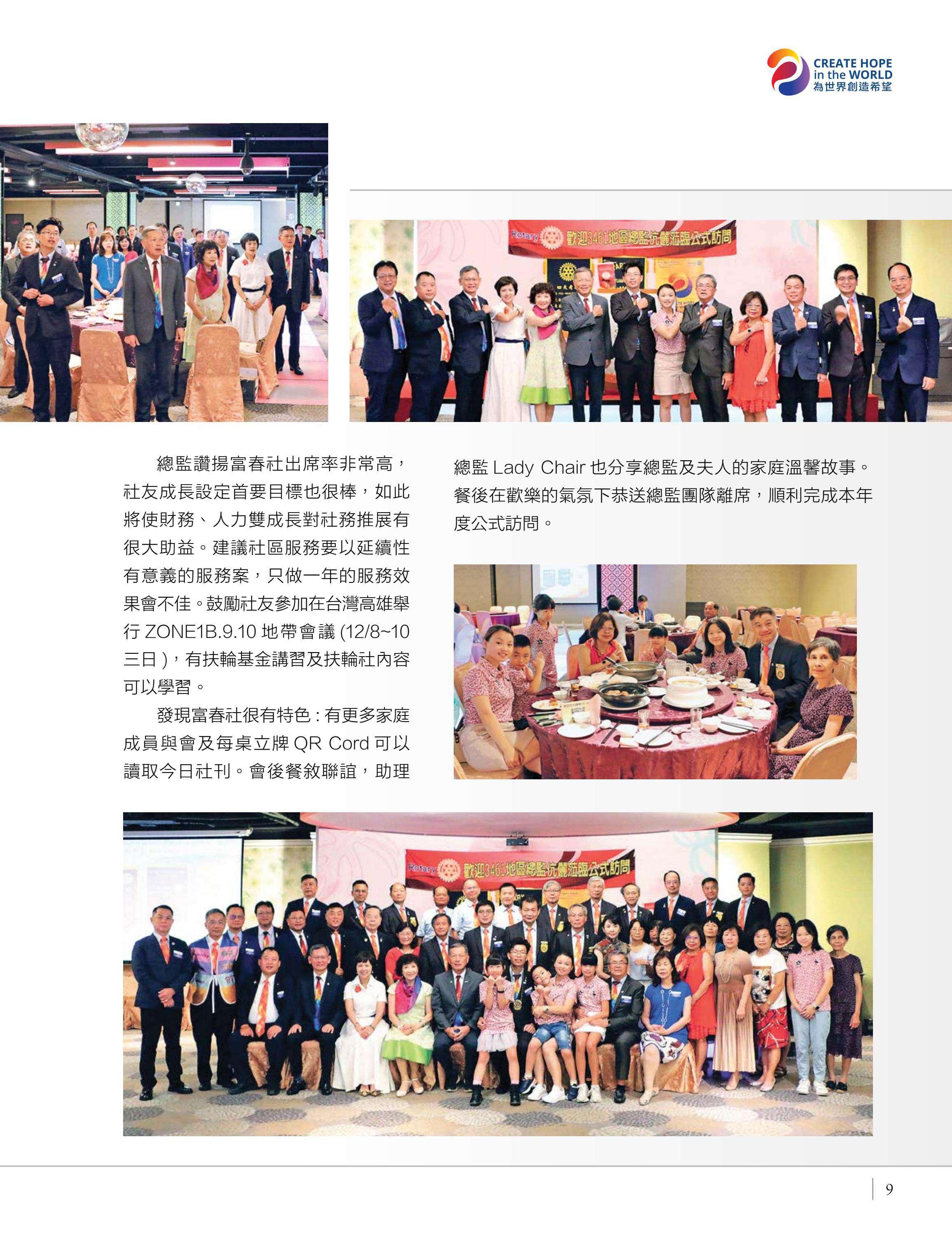 總監公訪走訪台中中興、豐原富春、台中惠中、東友、東北、神岡、港北區、豐原、后里及大甲扶輪社,由馮宏雲、于芷卉、王飛龍等社員記錄各地社團的熱情故事,展現3461地區的多元風采。台中向上扶輪社第六屆社長就職暨梨山復建計畫捐贈儀式由賴育生分享,彰顯服務與傳承。台中馬拉松社就職典禮由卓秋季記錄,象徵新年度的接棒,**台灣四東會「雄嘛吉!港都搖滾之夜」**由簡本昌呈現,點燃跨社團的熱情。