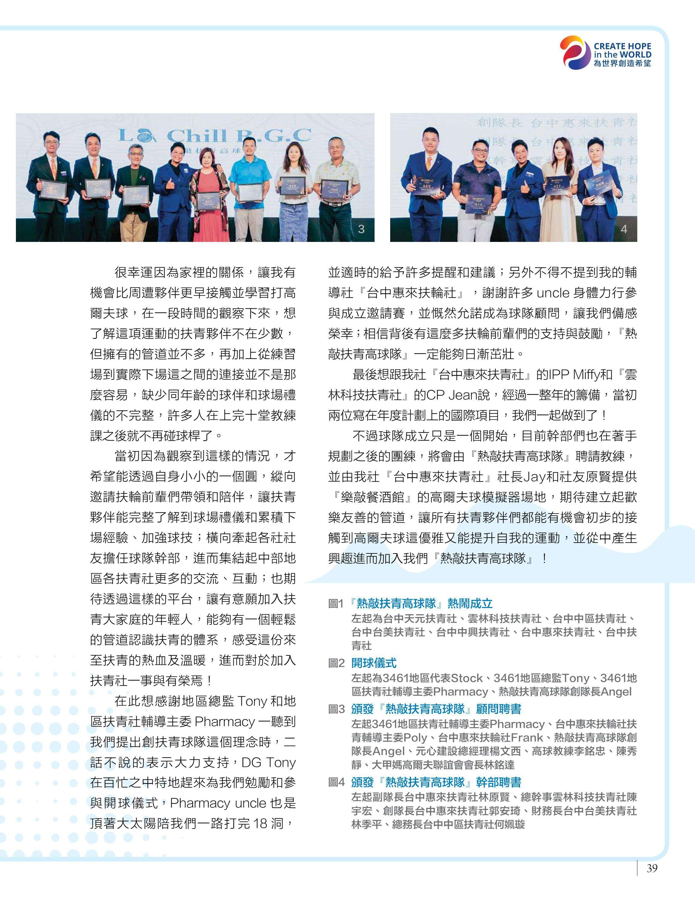 扶輪的行動力無處不在!2023-24年度生命橋樑助學計劃第一次籌備會議由臧瑞明報導,為年輕人鋪就夢想之路。一條溫度的牽繩讓視障朋友動起來由陳昭君書寫,分享台中馬拉松社如何用愛陪伴視障朋友。熱敲扶青高球隊成立邀請賽由郭安琦記錄,展現扶青社的青春活力。總監接受台中教育廣播電台專訪由郭威廷分享,推廣3461地區的公益精神。