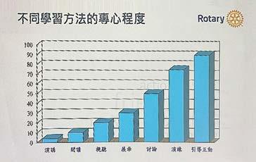 (a) 傳統式講師用講授的方式,學員用聽的學習,講 習效果依據統計,用聽的只有約20%的效果。換 改用引導人方式教學,透過參與議題的問答、討 論、思辨、歸納、效果可達 90%,並對議題印象 深刻。為增進學習效果,扶輪遂思研習會議改採引 導人方式,並將Club Trainer 社訓練師改為Club Learning Facilitator中譯即為「社學習引導人」, District Trainer 地區訓練師改為District Learning Facilitator 地區學習引導人。