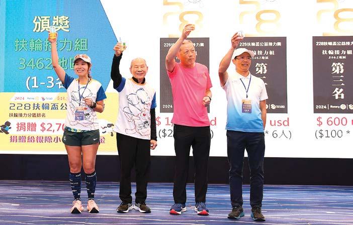裁判長說:挖!太可惜了,您報名時沒報在「扶輪 接力組」,您報到扶輪接力「女子組」去了,這組是專 給女社友和寶眷合組一隊去競爭團體排名是沒獎金的, 是鼓勵女生多多組隊來參加228賽事。