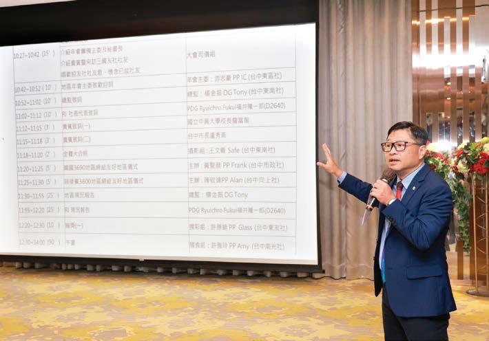 下來是3月4日的年會高爾夫球賽,由台中南 門社主辦,在台中國際高爾夫球場舉行,報名 人數達最上限400人;3月16日的地區年會 即將在中興大學惠蓀堂舉行,在年會團隊的精 心規劃下,社友們熱烈報名參加讓總人數達到 3180人,當天RI社長代表是日本大阪堺扶輪 社的前總監 福井隆一郎,有韓國3690姊妹地 區代表,菲律賓3800友好地區代表及日本地 區的社友們前來參加,期望是一個知性,感性 充滿歡樂氣息的年度盛事。