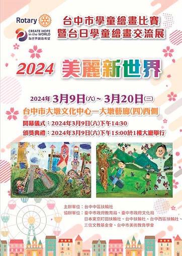 台中中區扶輪社於1979年由台中扶輪社輔導創立,本 社也於1989創立台中西區扶輪社,於1980年與日本東京町 田扶輪社結盟,正式展開台日學童繪畫比賽交流展長達44年 之久,一個很有意義的跨國公益活動,能每年持續舉辦逾40 年,實屬不易,同時增進台日扶輪好友情誼。同時感謝台中 市美術教育協會、三信文教基金會的協助讓活動順利完成。