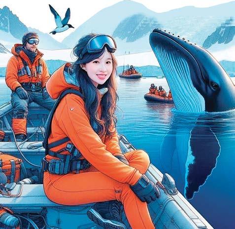 巴布亞企鵝等,在雪地上搖搖擺擺,在海水中嬉戲玩 耍,非常有趣。在南極遇到海豹、海獅、海豹獅、海象 等,在冰雪上曬太陽,或是在海裡捕食,展現出強大的 生存能力。我們很幸運看到座頭鯨、虎鯨在海面上噴水