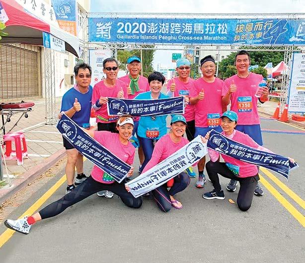 礙於人情壓力的…,那些沒跑過全馬的社友或 夫人,拉攏將近10位,成立了「勇於挑戰自我 的初馬勇士」群組,並把另一半拉近來當「推 手」,負責陪伴與關懷,以及擔任出氣筒。