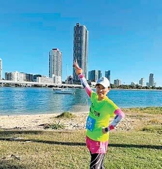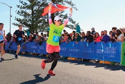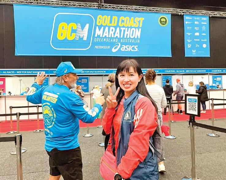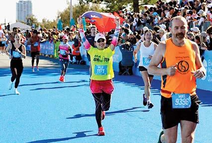 Angel高舉國旗,奔跑衝向「黃 金海岸馬拉松」終點線。終點前100 公尺,賽事特別設置多層次「觀看 台」,讓觀眾遊客有「座位」為選手 加油吶喊,熱情高漲。選手沉浸歡呼 聲中,一一衝進終點線。