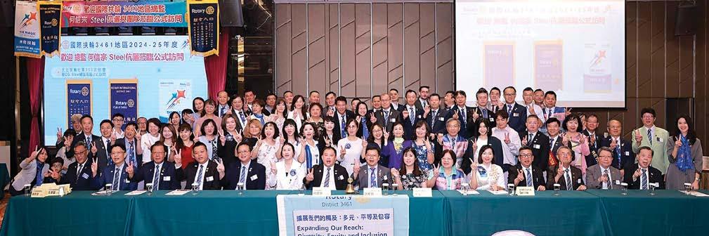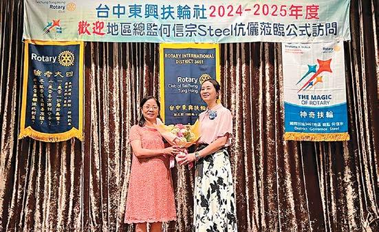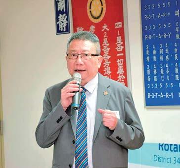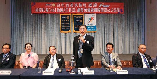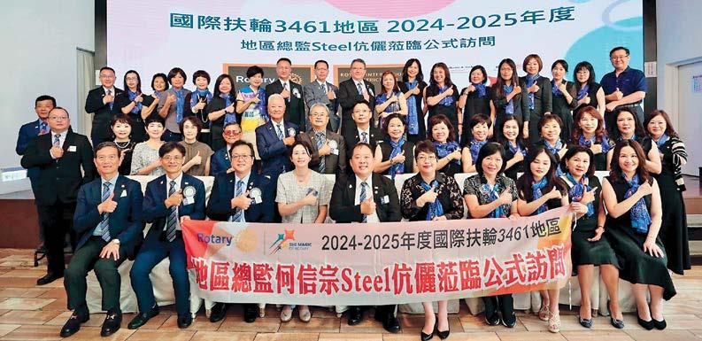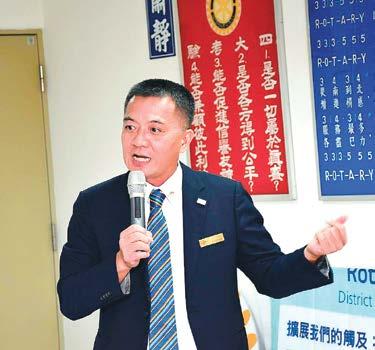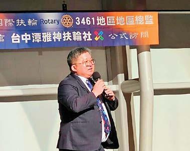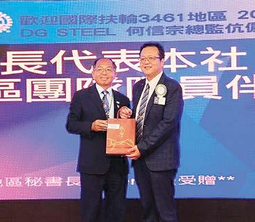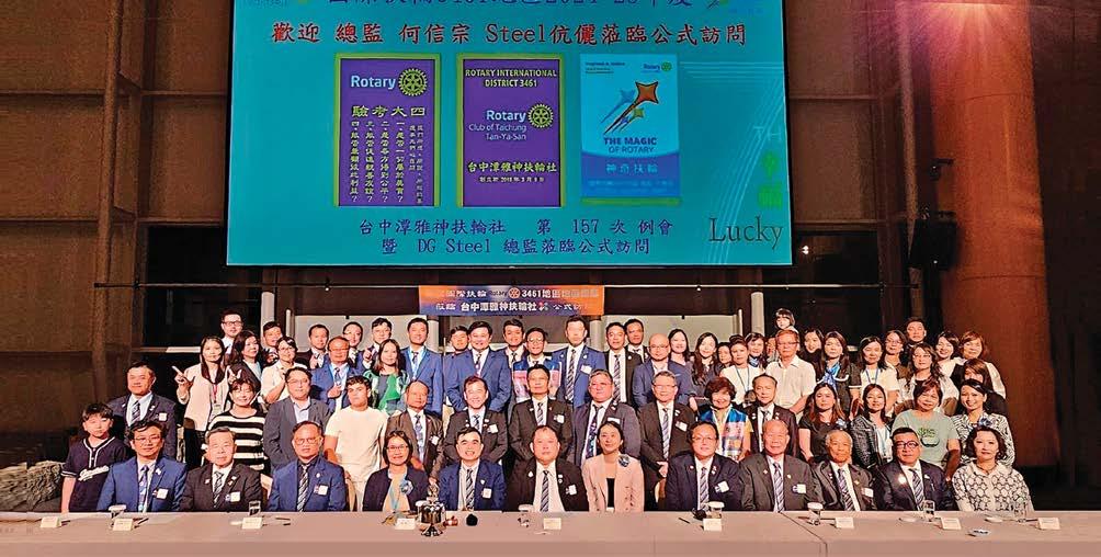 默風趣的方式介紹總監Steel及夫人,總監全心 戮力執行扶輪各項服務及行政工作,溫柔婉約的 夫人是最堅強的後盾。接著總監Steel說明今年 度的計畫及目標,期許扶輪基金達到目標50萬 美金,及新社友淨成長至少5%。總監Steel高 度肯定台美社一直秉持極優質的形象,社友充 滿活力及凝聚力,各項服務計畫的規劃及執行, 也都很完整並深具影響力。總監並鼓勵台美社結 交國外姐妹社,除了增加全球獎助金的資源,也 可以藉此拓展國際視野。他同時也特別鼓勵社友 踴躍報名參加下一屆在台北舉辦的世界年會。殷 殷囑咐,任重而道遠。接著下來,地區年會主委