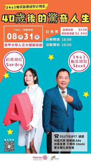 這次3461地區的扶青社聯 合例會,主題定為「四十歲後 的驚奇人生」,無論是講師的 分享,還是總監的規劃,都讓 我對未來的生活和目標有了新 的啟發。首先,這次邀請的特 別嘉賓是網路YT知名教英文的