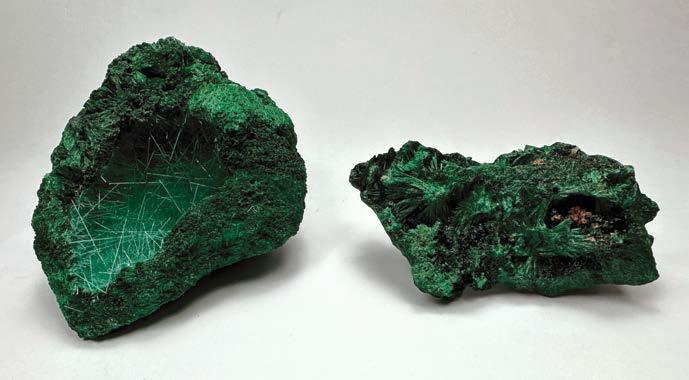 態的綠色孔雀石,並帶有共生礦 物,在燈光照射下呈現柔軟潤美 的絹絲光澤。