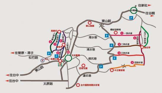 設在涼亭)。大坑步道有台中後花園之 名,並享有台中陽明山,台中市政府共 設置12條不同等級的登山步道,從散