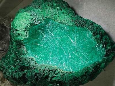 成樹枝狀的綠色礦物,而晶洞 內部長了許多綠色長纖維狀的 物體,且以不規則方向排列, 在燈光照射下呈現閃閃亮亮的 玻璃光澤。令人疑惑的點是如 此細長的纖維狀物體。在大自 然中倒是相當少見。