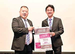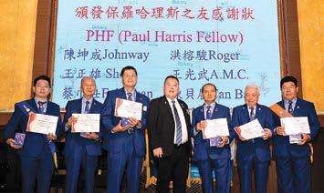 扶輪基金主委Mark報告鄭偉毓社長、熊 俊雄PP、楊聰熙PP共捐獻3顆保羅哈里斯 之友(PHF)。捐獻中華扶輪教育基金: 鄭偉 毓、楊聰熙、林輝煌、黃白親、熊俊雄以上五
