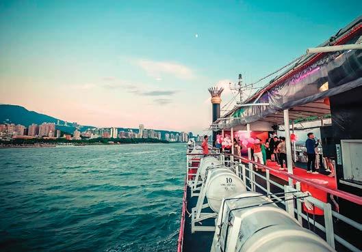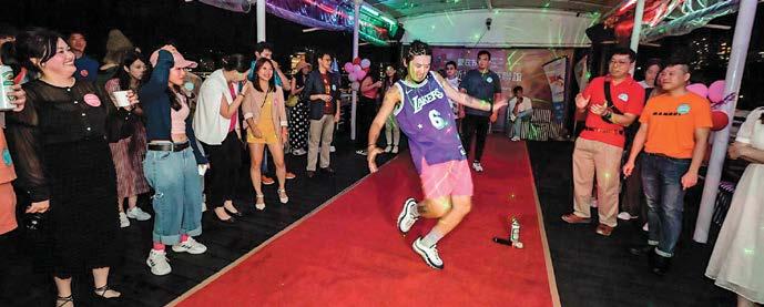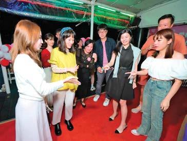 最後重頭戲就在甲板上舉 行聯誼舞會,DJ播放勁歌熱舞, 甲板上晚風徐徐,淺嘗雞尾酒, 氣氛非常High,會熱舞的學員 已開始Solo,大家也隨著音樂 舞動起來,當然害羞的學員就 躲在角落,三五成群聊天。最 後的小遊戲,在81位學員中, 必須我選中你,你又剛好選中 我的遊戲中,居然有6對成功 配對成功,實在不可思議,也代