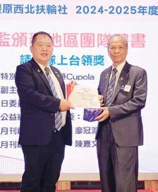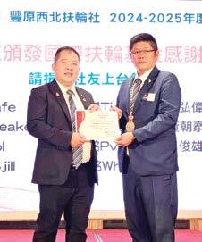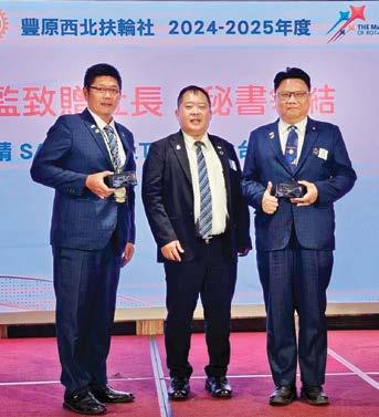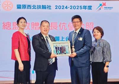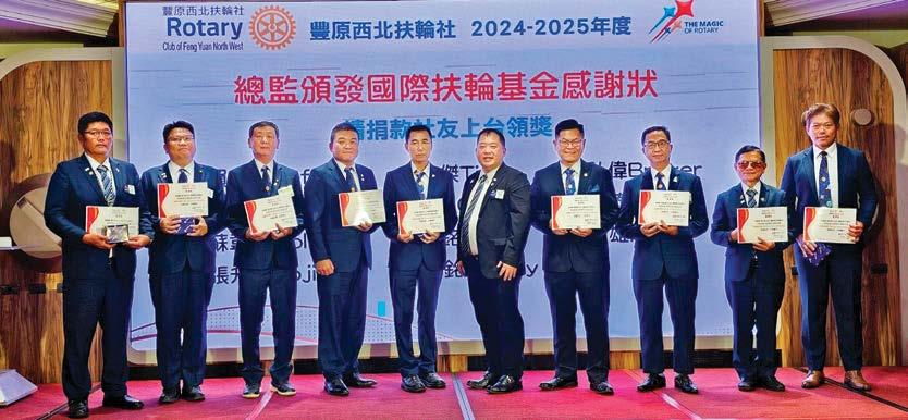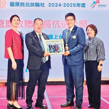 總監的勉勵充滿了激情與希望,卻也不失幽 默和詼諧,讓每一位社友都深受感動。總監像一 位遊子歸鄉般,真摯地回顧了自己與豐原東區扶 輪社的共同成長,他也強調每一位社友的努力都 為扶輪大家庭的進步貢獻了力量,這種情感的交 流更加強了豐原東區扶輪社的凝聚力。尤其今年 共有15位社友捐獻,獲得「保羅哈里斯之友」 獎章,總金額達到31,000美元。其中,有四位 社友已累計鉅額捐獻,這充分展示了全體社友對 扶輪的深厚支持與貢獻。