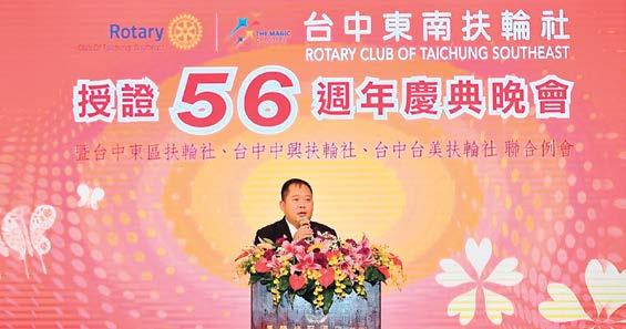 到了總監公訪的晚宴,總監Steel作為來自 豐原東區扶輪社的地區總監,這一身份賦予了他 與社內特殊的情感連結。在致詞中,總監表達了 對豐原東區扶輪社的感謝與期許,他提到,扶輪 社的服務不僅是對社會的服務,更是對世界的承 諾。他強調,扶輪社的四個優先完成事項,是當 前全球扶輪的核心目標,這也是豐原東區扶輪社 在未來將持續努力的方向。