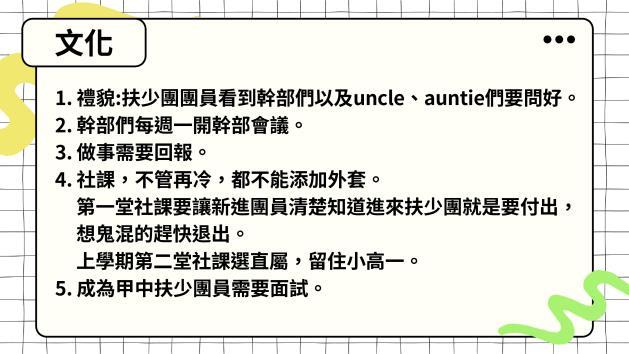 加入扶少團是我在高中裡最正確的決定了,我很感謝扶少 團給我的每次機會,包含上台演講,拓展人際關係,等等… , 都對我有很大的幫助,若不是扶少團,我現在也沒有機會在這 裡與你們分享,而且因為成為了團長,所以對於上台演講這方 面我已經不那麼緊張了。