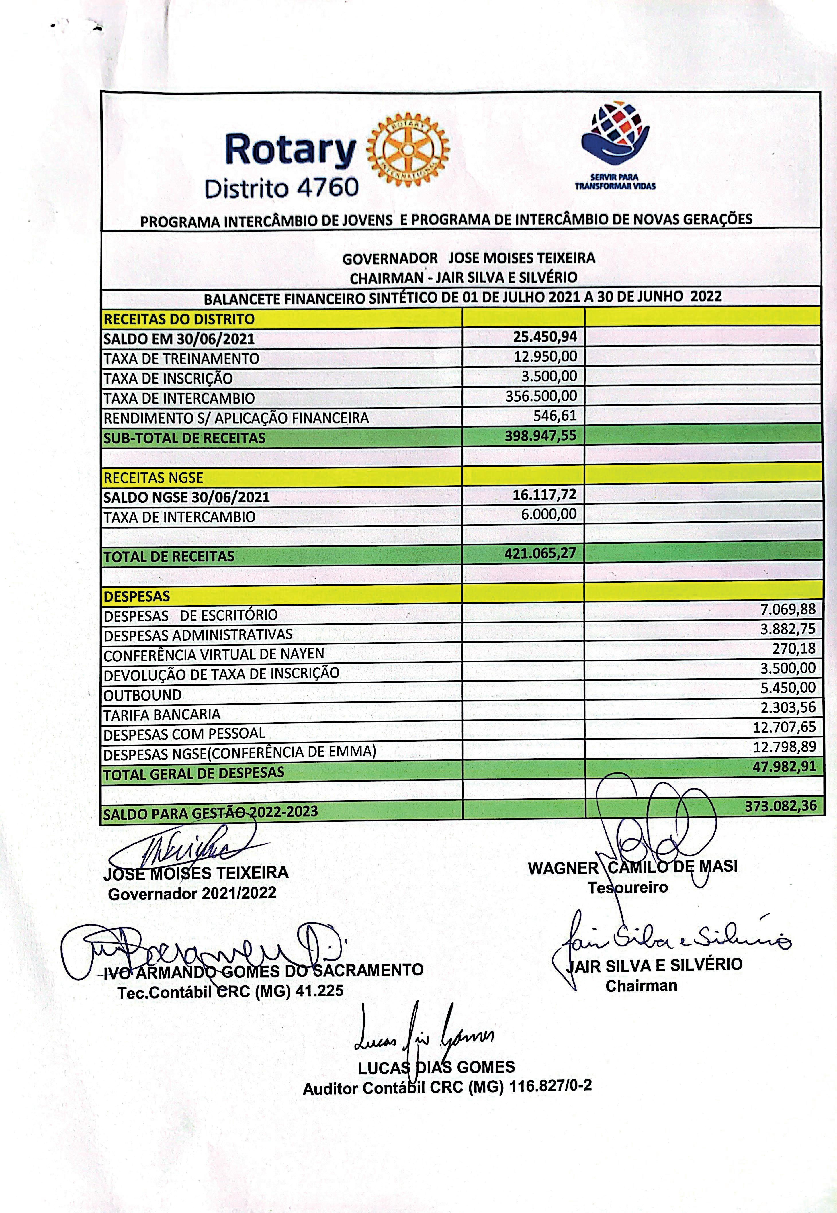 SECRETÁRIO DISTRITAL Nathan Oliveira Fernandes TESOUREIRO DISTRITAL Wagner Camillo De Masi INSTRUTOR DISTRITAL GD Agnaldo Pereira de Assis Costa PROGRAMA DE INTERCÂMBIO DE JOVENS Jair Silva e Silvério INFORMATIVO MENSAL Coordenação.: Luiz Antônio de Oliveira LimaGovernador 2022-23 Diagramação: Elen Marques (MG-050034JP) - RE-Club Minas Gerais Colaboração: Clara Marques Projeto Gráfico: Vítor de Andrade - RC e RTC Pirapora-Praia FICHA TÉCNICA