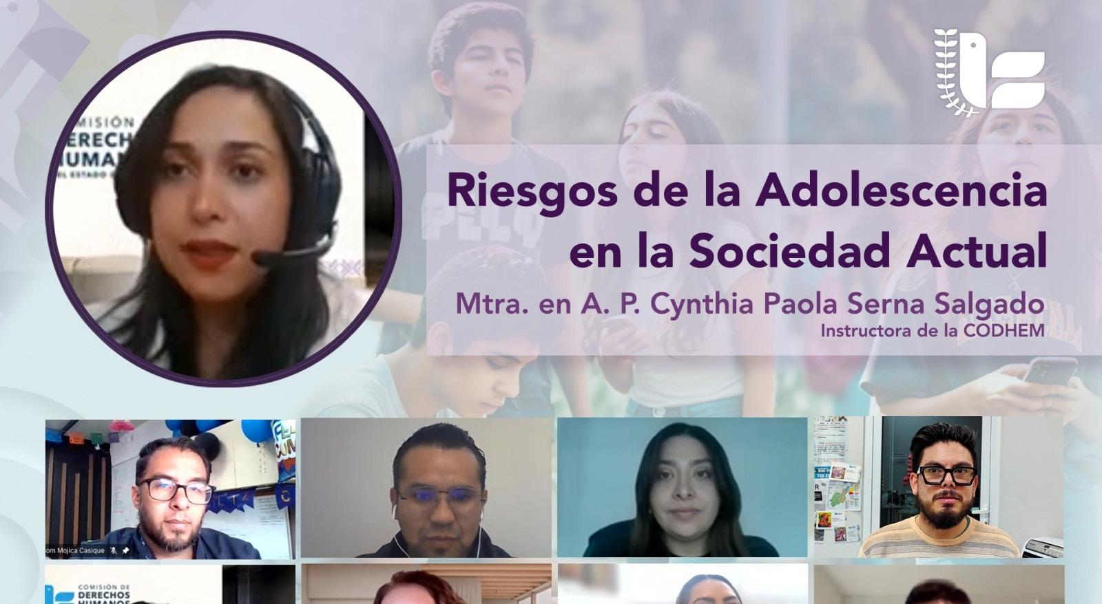 En la videoconferencia “Riesgos de la adolescencia en la sociedad actual”, Cynthia Paola Serna Salgado, promotora de derechos humanos de la Comisión de Derechos Humanos del Estado de México (CODHEM), resaltó la importancia de comprender y apoyar a los adolescentes en su desarrollo. Según Serna Salgado, esta etapa, que abarca de los 10 a los 19 años, es un momento crucial en la vida de los jóvenes, quienes deben tener la oportunidad de equivocarse y aprender de sus errores, ya que esto influirá en la formación del adulto que serán en el futuro.