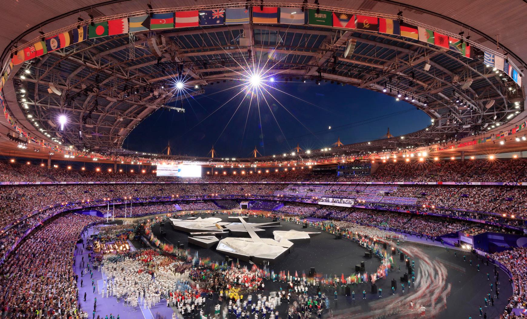 El Estadio de Francia durante el desfile de la ceremonia de clausura de los Juegos Olímpicos de París 2024 // El actor Tom Cruise descendiendo en el Estadio de Francia, durante los Juegos Olímpicos de París