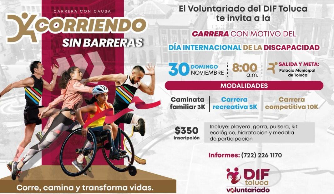 El Voluntariado del DIF Toluca lanzó una invitación abierta a la población para participar en la primera edición de la carrera con causa “Corriendo sin Barreras”, cuyo objetivo es promover la inclusión, la solidaridad y el apoyo comunitario. Lo recaudado en las inscripciones será destinado a la adquisición de aparatos funcionales para personas en situación de vulnerabilidad, como bastones, andaderas y sillas de ruedas.